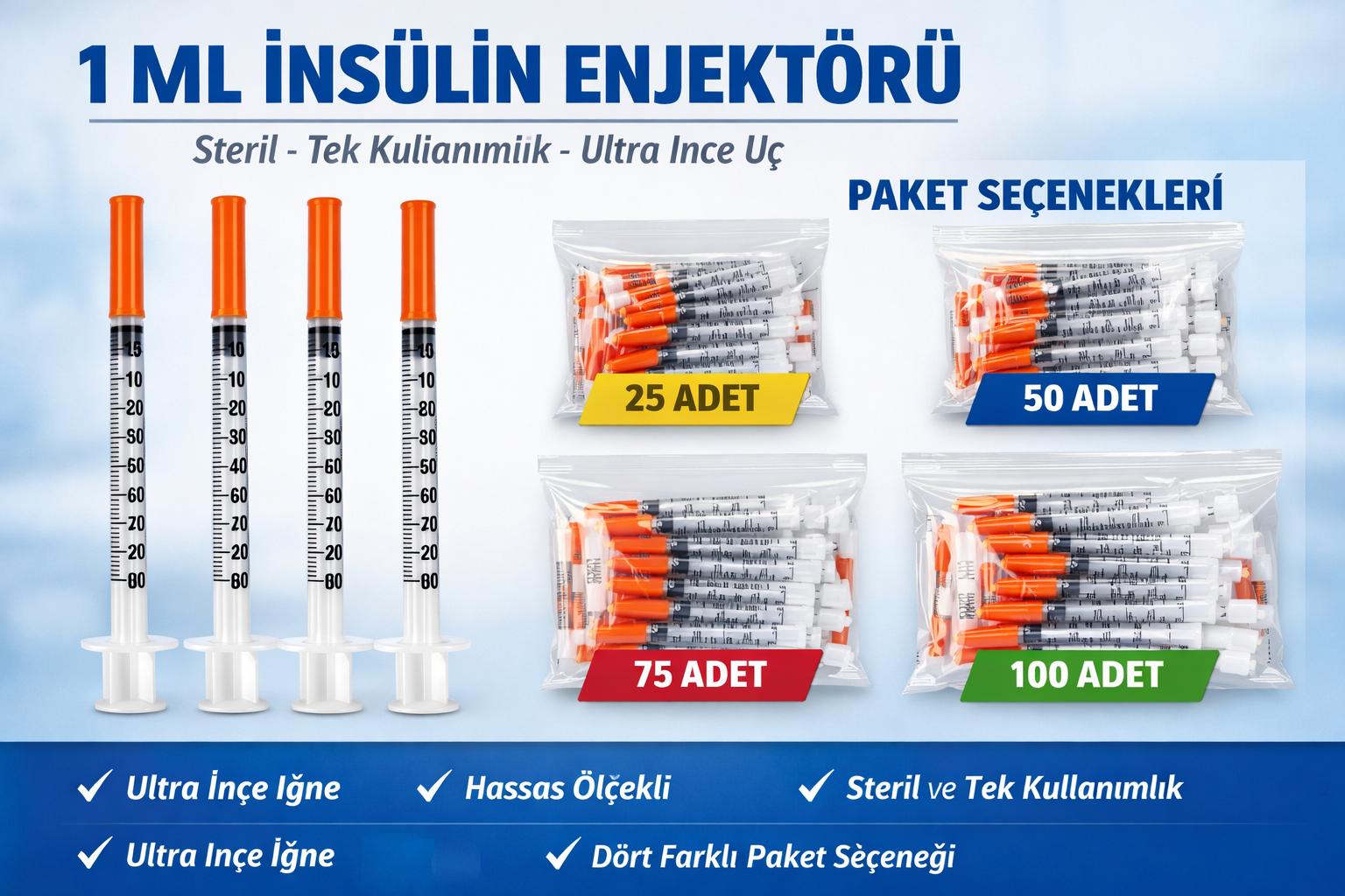 1 ml insülin enjektörü, insülin şırıngası 1 ml, 30g enjektör, ince uç enjektör 8mm, steril insülin enjektörü, tek kullanımlık enjektör, 25 adet insülin enjektörü, 50 adet insülin şırıngası, 75 adet enjektör, 100 adet insülin enjektörü, medikal enjektör, diyabet enjektör ürünleri