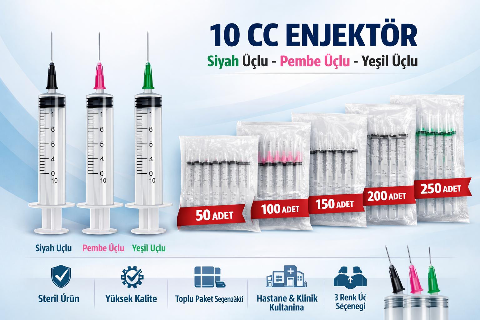 10 cc enjektör, 10 ml enjektör, siyah uçlu enjektör, pembe uçlu enjektör, yeşil uçlu enjektör, 10 cc şırınga, medikal enjektör, steril enjektör, 50 adet enjektör, 100 adet enjektör, 150 adet enjektör, 200 adet enjektör, 250 adet enjektör, toplu enjektör satın al, hastane enjektörü, klinik enjektör ürünleri, laboratuvar enjektörü