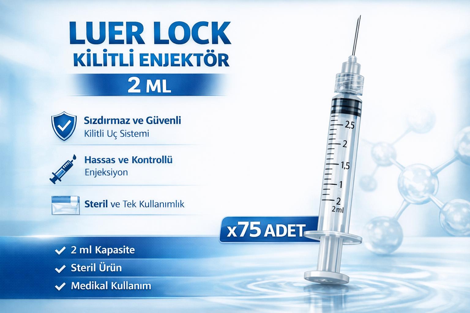 2 ml Luer Lock kilitli enjektör, enjeksiyon sırasında maksimum güvenlik sağlayan kilit mekanizmasına sahiptir. Sağlam uç bağlantısı ile sızdırmaz kullanım sunar. Klinik ve medikal işlemlerde yaygın olarak tercih edilir. 25, 50, 75 ve 100 adetlik paket varyasyonları ile satışa sunulmaktadır.