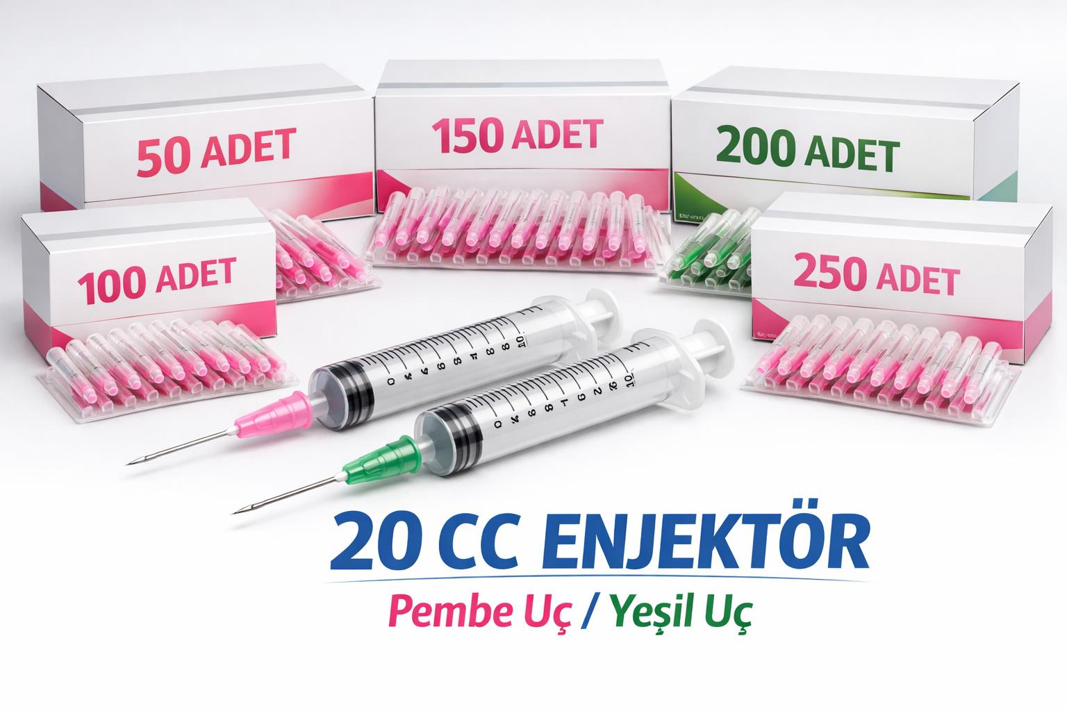 20 cc enjektör, 20 ml şırınga, pembe uçlu enjektör, yeşil uçlu enjektör, tek kullanımlık enjektör, steril enjektör, medikal şırınga, hastane tipi enjektör, klinik enjektör, veteriner enjektör, 50 adet enjektör, 100 adet enjektör, 150 adet enjektör, 200 adet enjektör, 250 adet enjektör
