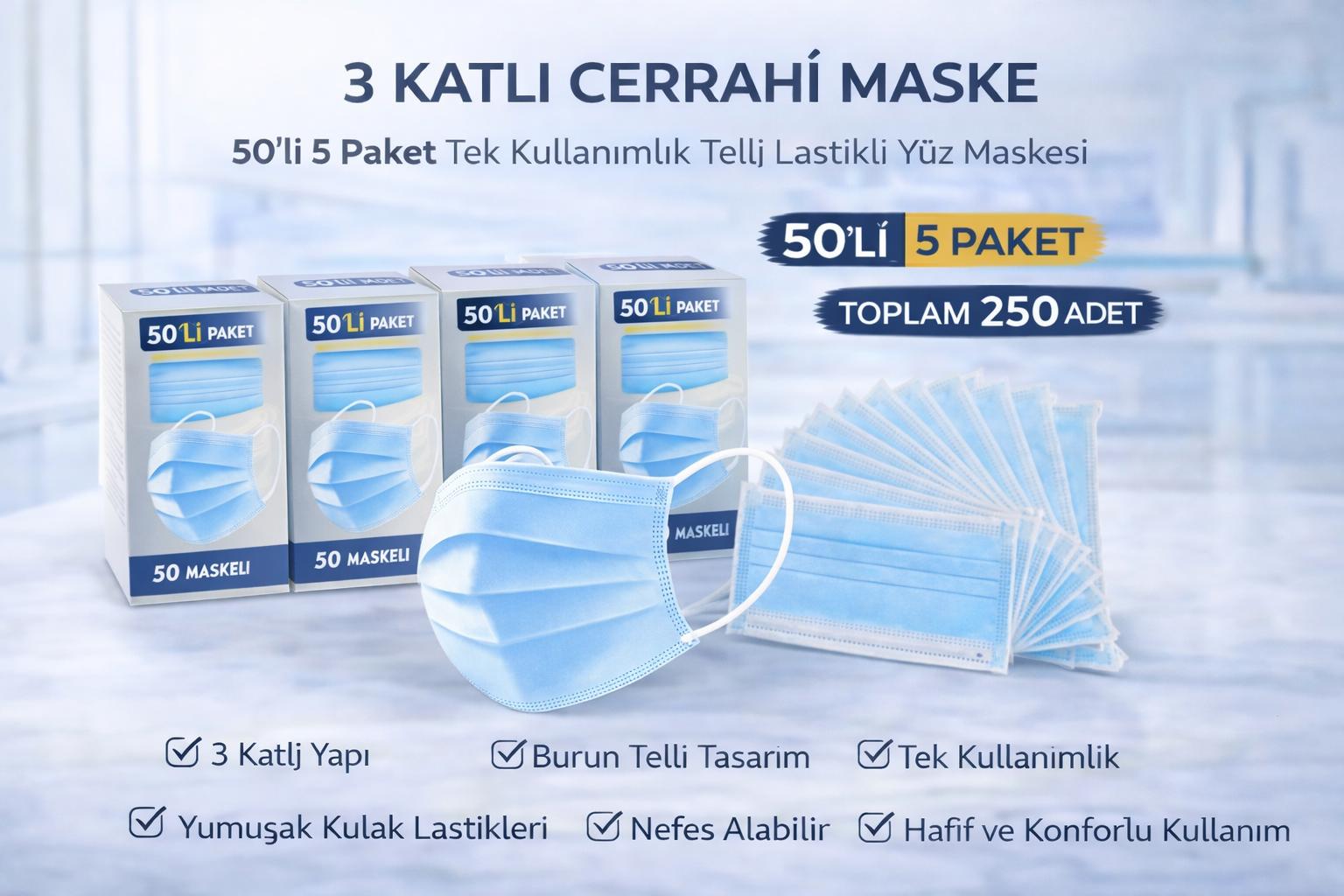 3 katlı cerrahi maske 50’li 5 paket halinde sunulmaktadır ve toplamda 250 adet tek kullanımlık maske içerir. Günlük kullanım ve hijyen gerektiren ortamlarda pratik koruma sağlamak amacıyla üretilmiştir. Üç katlı yapısı sayesinde etkili filtrasyon desteği sunarken nefes alabilir yapısı ile konforlu kullanım sağlar.
