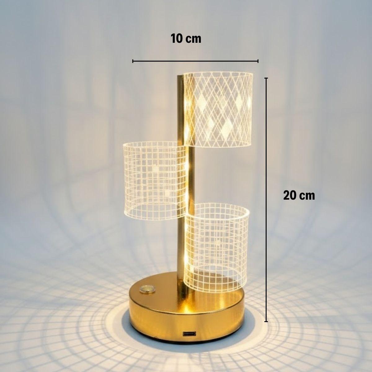 3 Parça Silindirik Kristal Ekose Kareli LED Masa Lambası – Gold Gövdeli, Dokunmatik, 3 Kademe Işık Ayarlı Şarjlı Dekoratif Lamba