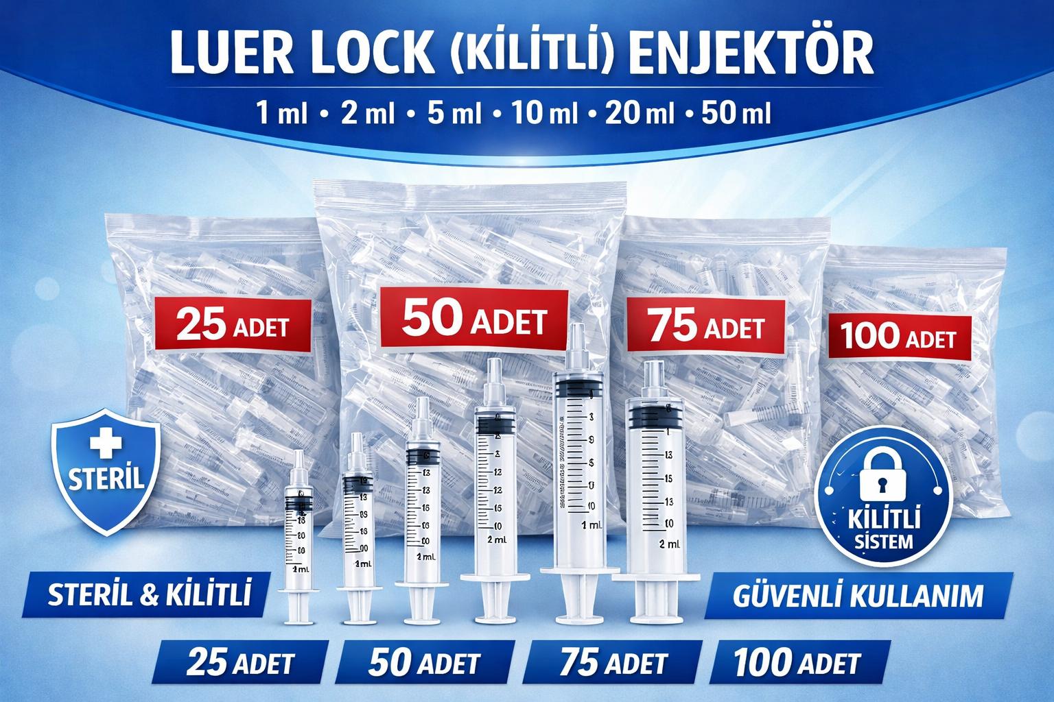 5 ml luer lock enjektör, kilitli şırınga 5cc, steril medikal enjektör, 25 adet şırınga, 50 adet şırınga, 75 adet şırınga, 100 adet şırınga