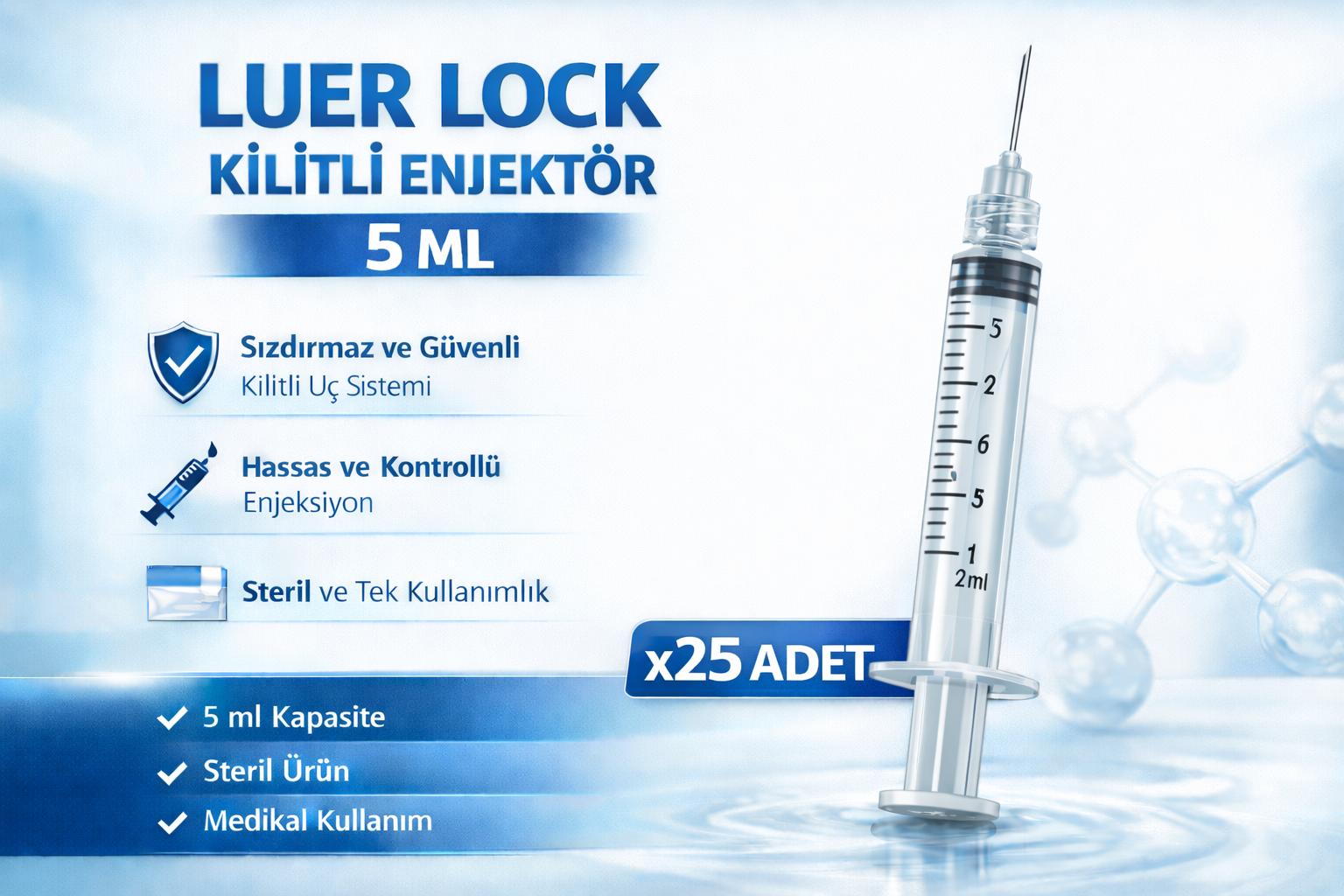 5 ml Luer Lock enjektör, sıvı uygulamalarında güvenli kilitleme sistemi ile öne çıkar. Kilitli uç yapısı sayesinde iğne bağlantısı sabitlenir ve kontrollü enjeksiyon imkanı sunar. Hastane, laboratuvar ve medikal kullanım için uygundur. 25 adet, 50 adet, 75 adet ve 100 adet paket seçenekleri mevcuttur.