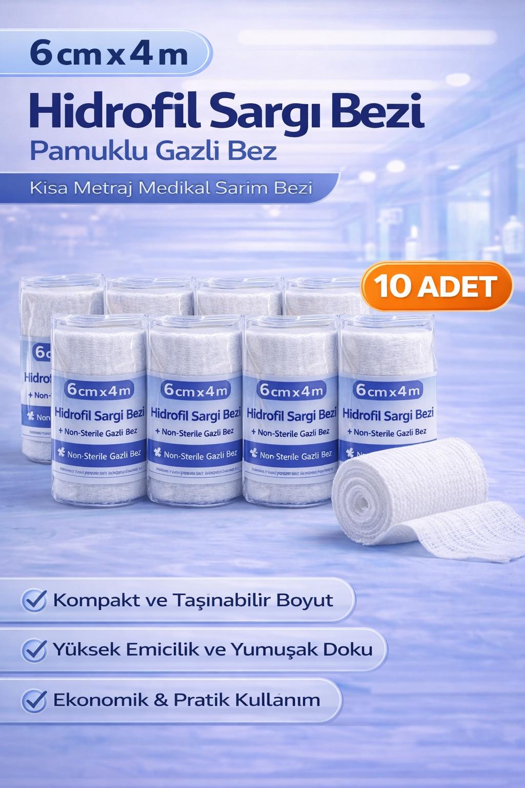 6 cm x 4 m Hidrofil Sargı Bezi Pamuklu Gazlı Bez Kısa Metraj Medikal Sarım Bezi 10 Adet