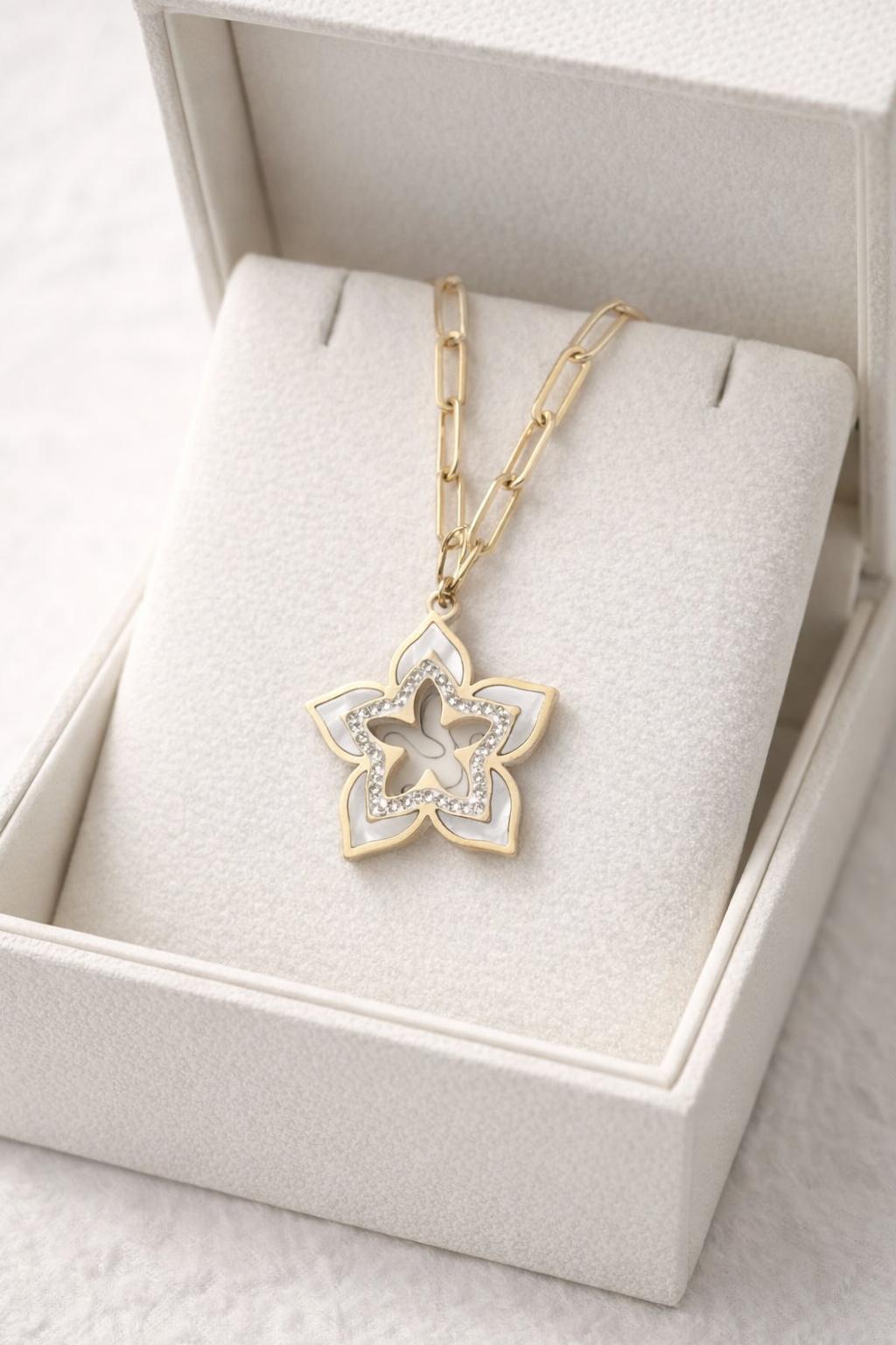 Şıklığı sade bir güçle birleştiren altın renk yıldız tasarımlı çelik kolye, hem günlük kombinlerde hem de özel anlarda stilini tamamlamak için tasarlandı.