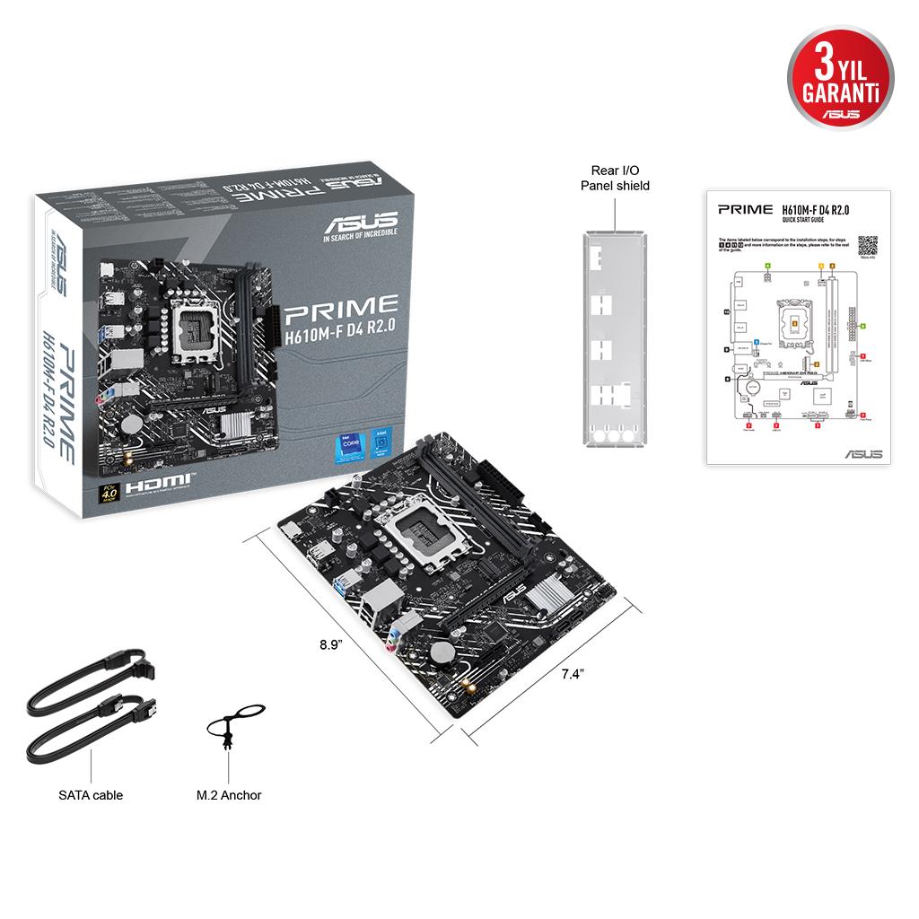 ASUS PRIME H610M-F D4 R2.0 Intel® H610 LGA 1700 micro-ATX anakart, PCIe 4.0, M.2 yuvası, DDR4, Realtek 1Gb Ethernet, HDMI™, SATA 6 Gbps ve USB 5Gbps bağlantı noktaları