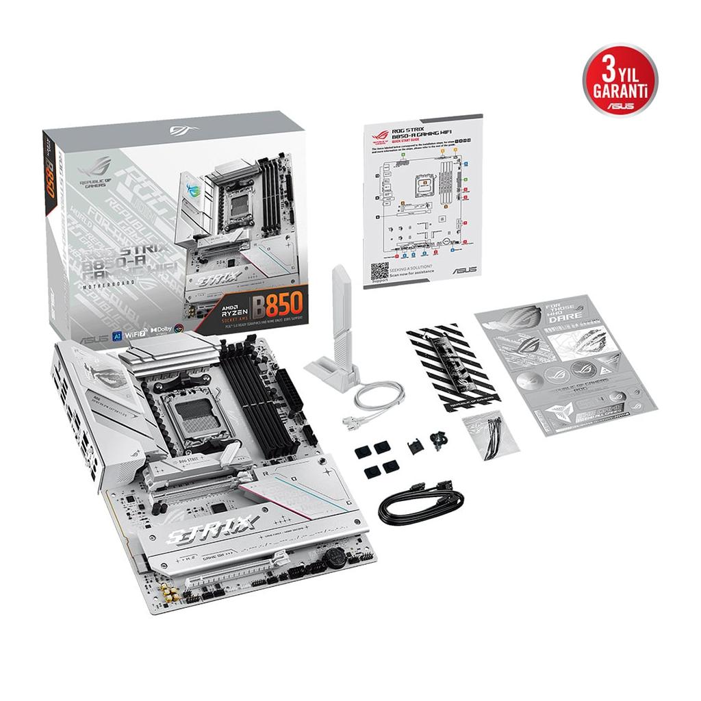 ROG Strix B850-A Gaming WiFi, sağlam 14 aşamalı güç, hiper hızlı DDR5 bellek ve yeni nesil PCIe 5.0® bağlantıları ile sistemlere hız katar. Ürün, soğutma bloklu dört adet M.2 SSD yuvası, USB 20Gbps Type-C® desteği, WiFi 7, ASUS AI Danışman, AI Networking II ve Aura Sync RGB aydınlatma özelliklerine sahip.