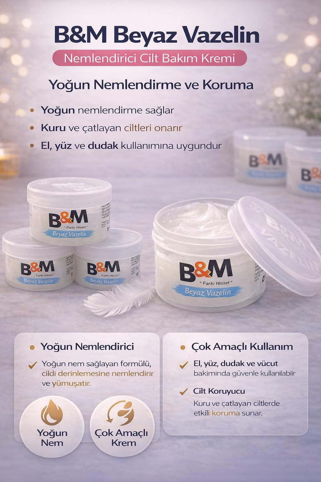 B&M Beyaz Vazelin, ciltte yoğun nem sağlayan ve kuruluğa karşı etkili koruma sunan çok amaçlı bakım ürünüdür. Özellikle kuru ve hassas ciltler için geliştirilmiş formülü sayesinde cildi besler, yumuşatır ve dış etkenlere karşı korur.