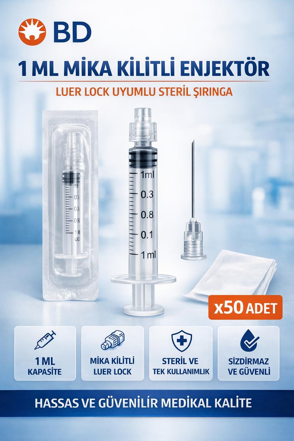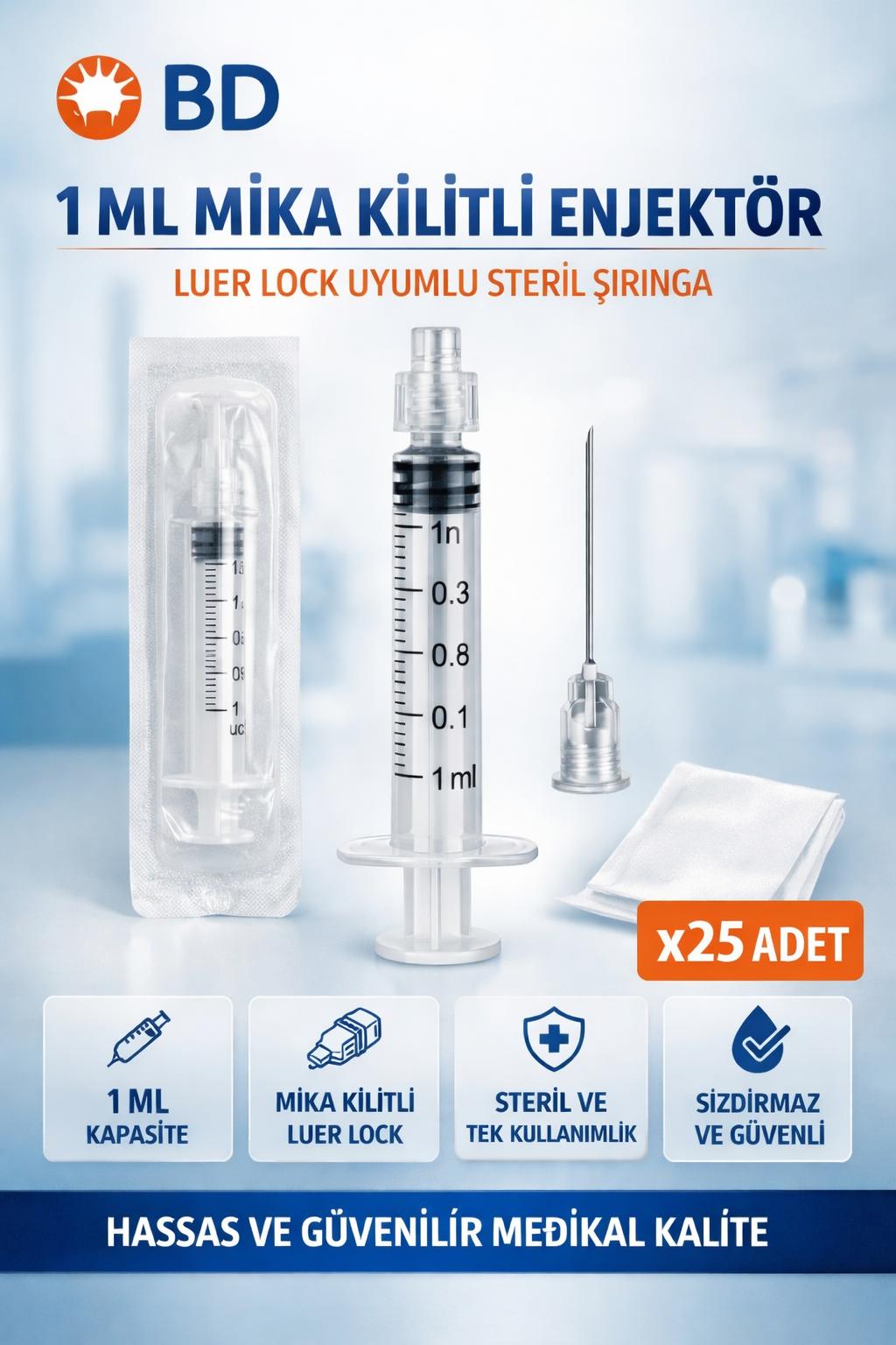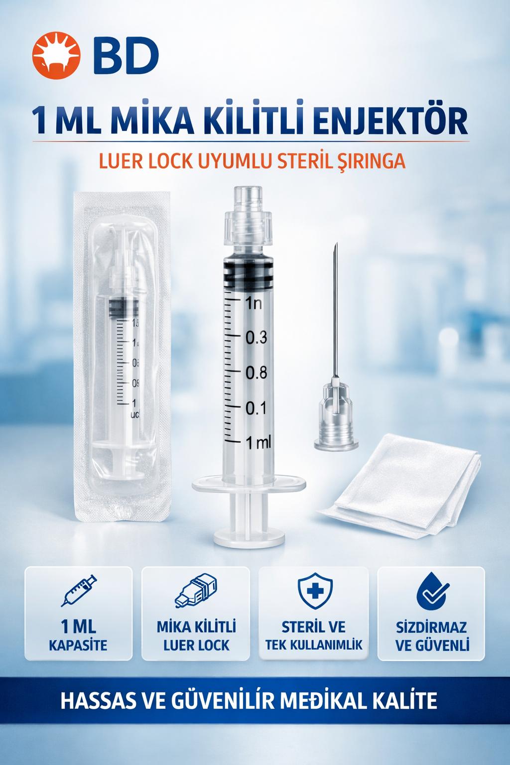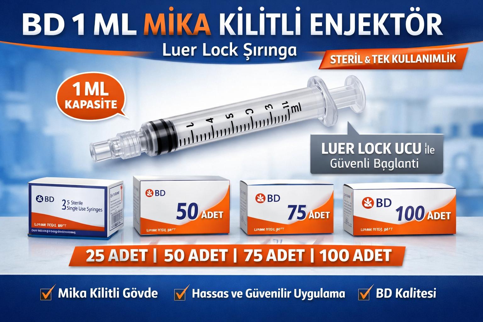 BD 1 ml enjektör, BD mika kilitli enjektör, luer lock şırınga, kilitli uç enjektör, 1 ml şırınga, steril enjektör, tek kullanımlık enjektör, BD şırınga, 25 adet enjektör, 50 adet enjektör, 75 adet enjektör, 100 adet enjektör, medikal enjektör, hastane tipi şırınga, klinik enjektör