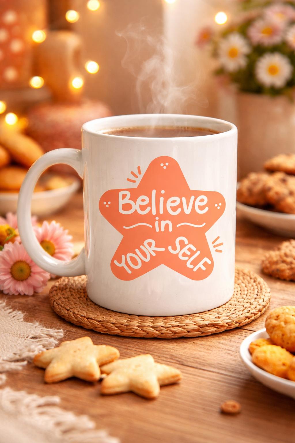 “Believe in Yourself” yazılı bu özel tasarım porselen kupa, her yudumda sana kendini hatırlatır: Kendine inan, çünkü sen buna değersin!