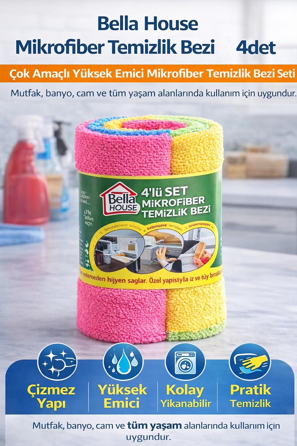 Bella House Mikrofiber Temizlik Bezi 4 Adet (4’LÜ 1 RULO)Çok Amaçlı Yüksek Emici Mikrofiber Temizlik Bezi Seti
