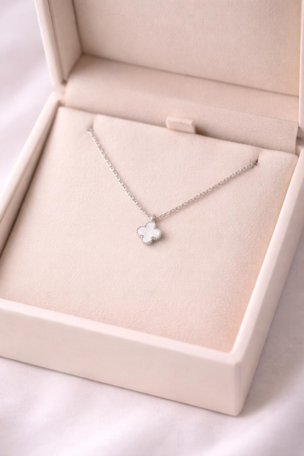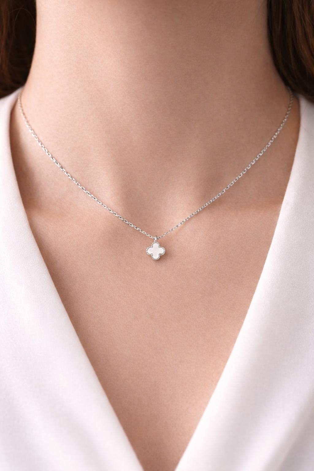 Beyaz Yonca Figürlü Çelik Kolye MODEL 17 – Kararmaz, Paslanmaz, Minimal & Şık Kadın Kolyesi