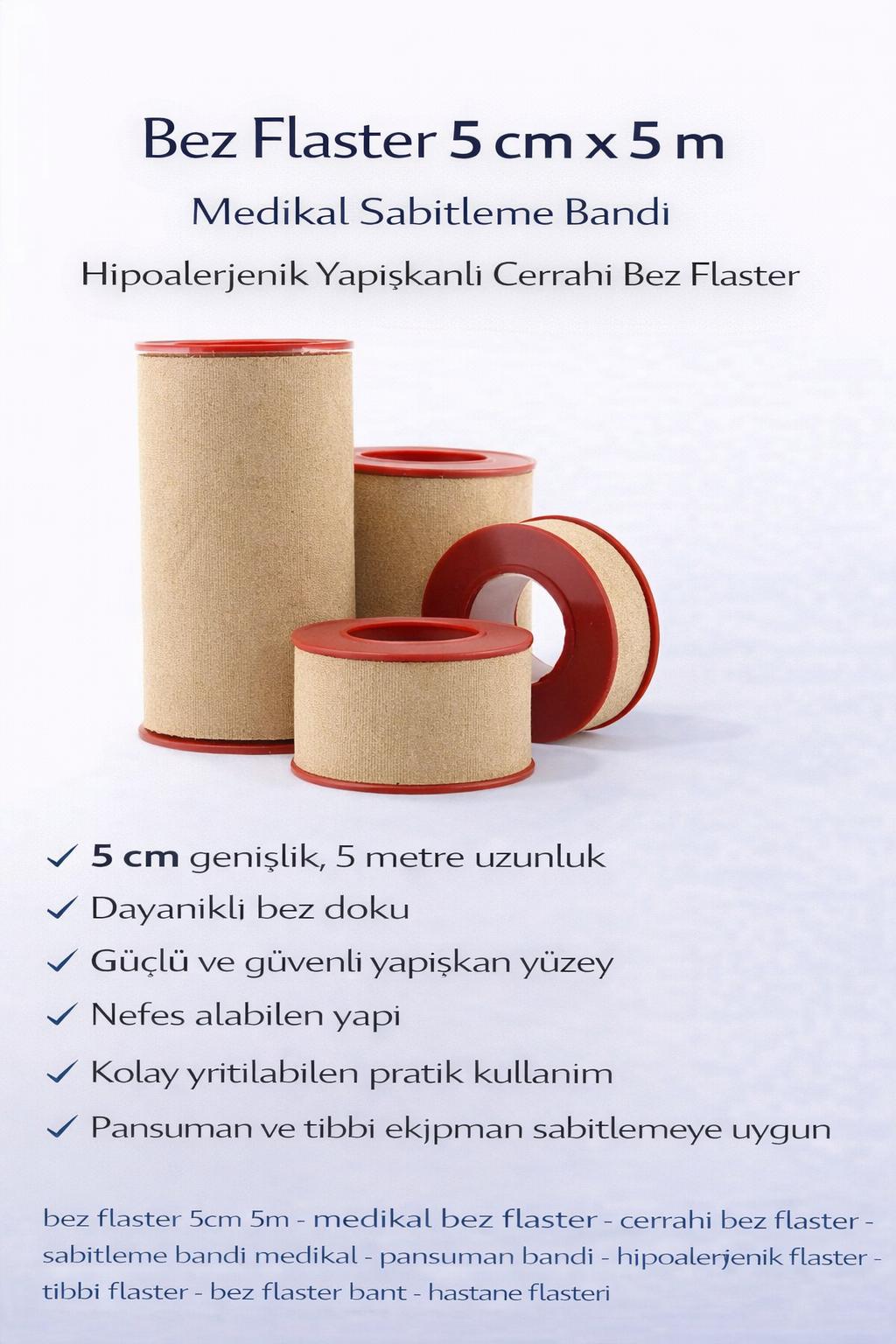 Bez flaster 5 cm x 5 m, medikal kullanım için üretilmiş, güçlü yapışkanlı ve dayanıklı sabitleme bandıdır. Esnek bez dokusu sayesinde cilt üzerinde rahat kullanım sağlar ve pansumanların güvenli şekilde sabitlenmesine yardımcı olur.