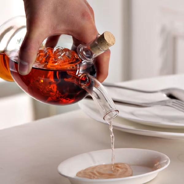 Cam 2'si 1 Arada Yağdanlık ve Sirkelik, şişe içinde iki ayrı bölme sunar. Dış hazneye sirke, içteki üzüm kabartmalı hazneye ise zeytinyağı veya farklı sıvılar eklenebilir. İç kısmındaki üzüm formu, hem dekoratif bir şıklık sunar hem de ürünü benzersiz kılar.