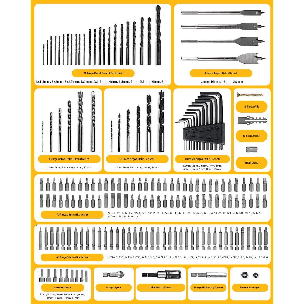 · 201 parça geniş çeşit delme ve vidalama uç seti sayesinde beton, metal, ahşap, PVC yüzeylerde delme, vidalama, somun başlı vidaların sıkma/sökme işlerinde, Allen anahtar seti ile çeşitli parçaların vidalarının sıkılıp sökülmesinde ihtiyaç duyacağınız tüm içeriğe sahiptir.