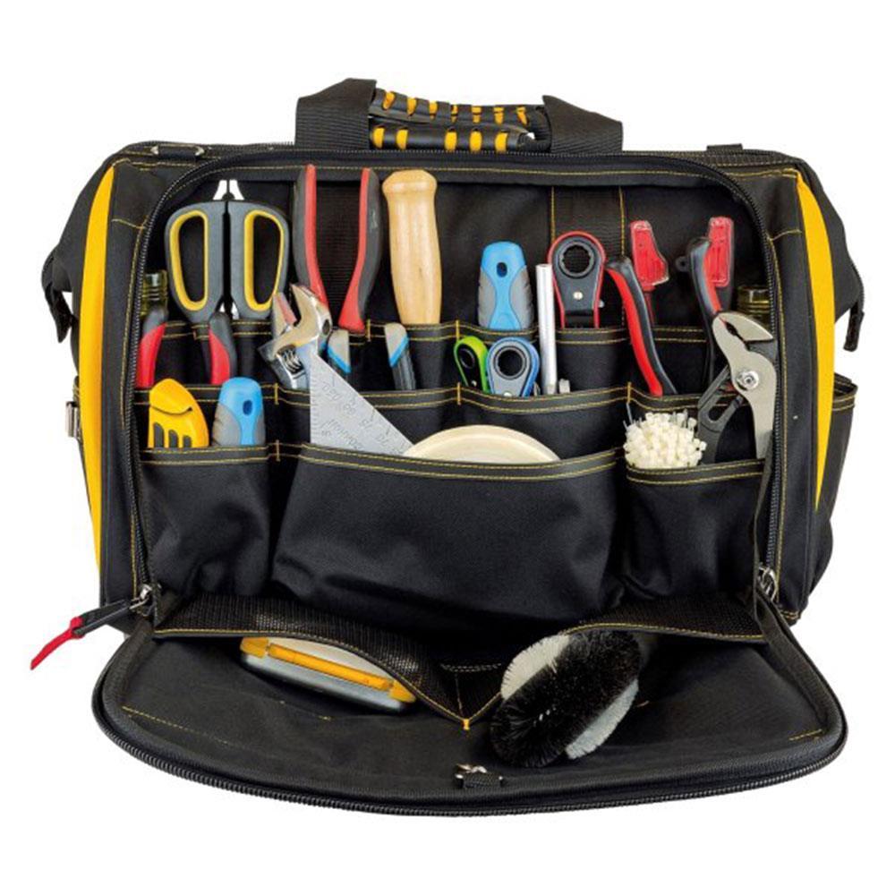 • Geniş ana saklama bölmesi elektrikli el aletlerini, kabloları, telleri, şarj cihazlarını, ölçüm cihazlarını ve daha fazlasını kolayca saklayabilmek içindir. Not defterleri, kılavuzlar ve diğer ince eşyaları saklamak için 2 yan cebe sahiptir.