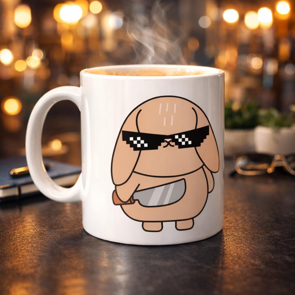 Kupanın üzerindeki tavşan figürü; rahat tavrı, karizmatik bakışı ve eğlenceli stiliyle “takıl kafana göre” mesajı veriyor. Günlük koşturmada bir mola, ofiste motivasyon, evde keyifli bir kahve anı için birebir!