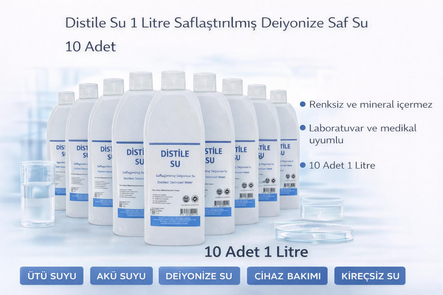 distile su, saf su 1 litre, deiyonize su, ütü suyu, akü suyu, saflaştırılmış su, laboratuvar suyu, medikal saf su, cihaz bakım suyu, kireçsiz su, distile su 10 adet