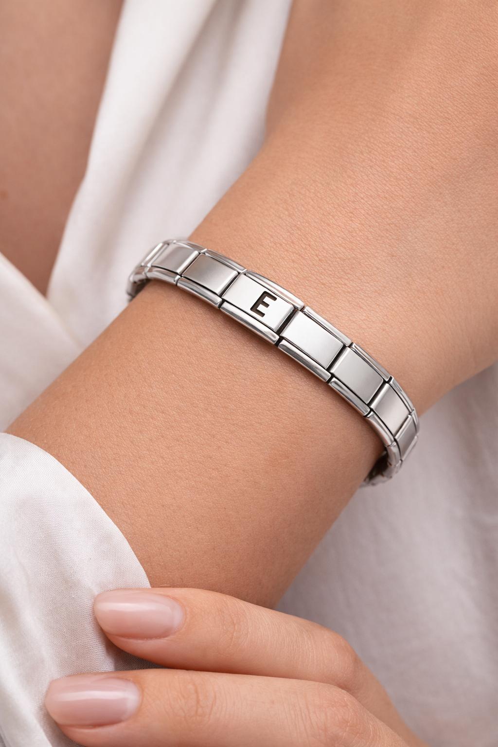 E Harfli Çelik Bileklik – Kişiye Özel Paslanmaz Çelik Kadın Bileklik – Esnek İtalyan Model