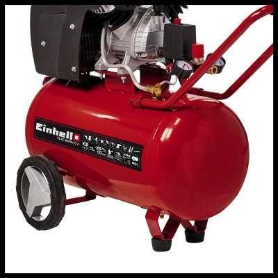 Einhell TE-AC 400/50/10 V kompresör, hem sabit hem de mobil olarak 2,200 W güçü ile bir çok alanda kullanabileceğiniz pnömatik kompresördür. Bu kompresör ile ve onunla birlikte kullanılacak doğru aletlerle, cila ve boyayı hemen uygulayabilir, ahşaba hassas bir şekilde koruyucu uygulayabilir, lastikleri, topları ve havalı yatakları şişirebilir, üfleme veya kumlama işi yapılabilinir. Maksimum çalışma basıncı 10 bar'dır ve farklı uygulamalar için ayrı ayrı ayarlanabilir. Einhell kompresörün dakikada 400 litre emiş hızı ve 7 barda dakikada 155 litre su verme hızı olan çift kompresör ünitesi sayesinde yüksek hava dağıtım hızı vardır. 50 litrelik tankta yeterli hava rezervi var. Yağlama sayesinde motoru uzun ömürlüdür. Yağ seviyesinin kontrolü için bir kontrol penceresi vardır. Kaplinli bağlantı ile birçok basınçlı hava aleti kolayca ve anahtarsız olarak monte edilir ve kolayca kullanılabilir.Kontrolsüz çalışma basıncı ve kontrolsüz tank basıncı için entegre bir manometre vardır. Kullanıcı güvenliği için güvenlik valfi ve geri dönüşsüz valf bulunur. Titreşim önleyici ayak yapısı güvenli destek sunar. Kompresördeki boşaltma tapası kullanıcı dostu bakım sağlar. Büyük tekerlekler ve taşıma çubuğu, taşınmasını ve taşınmasını kolaylaştırır. Einhell, tankın paslanmasına karşı 10 yıl garanti vermektedir.