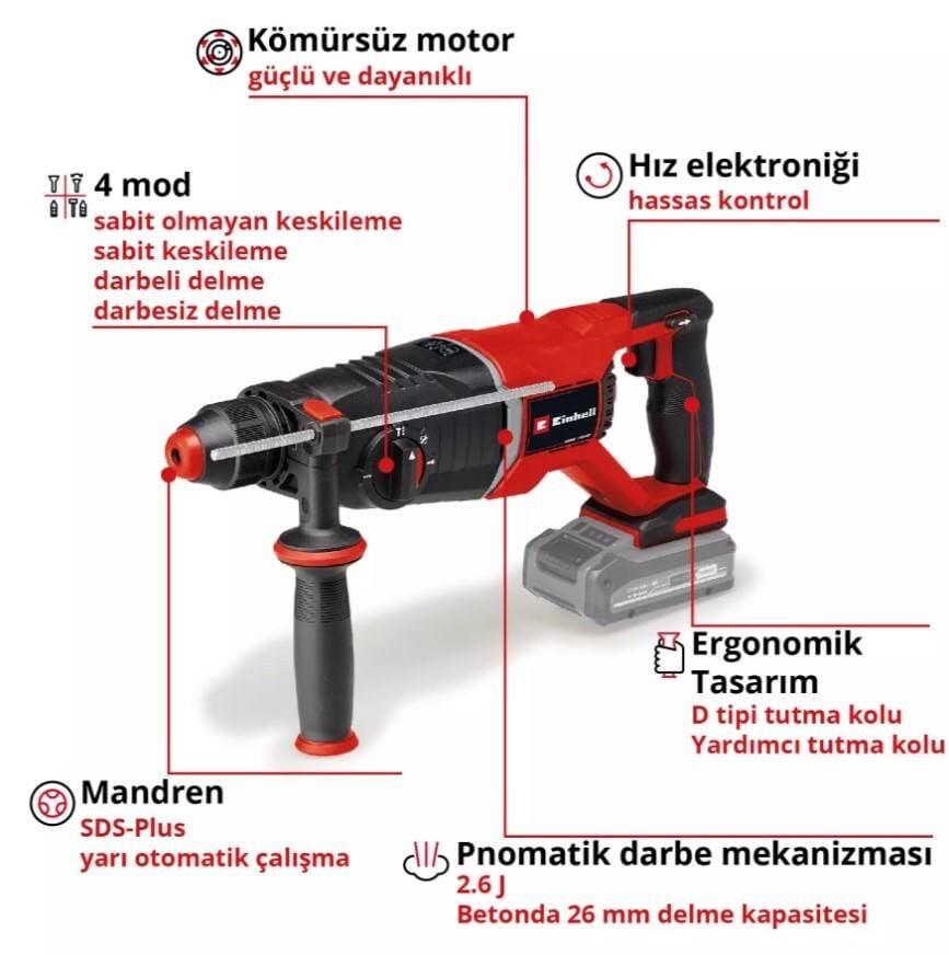 Einhell Professional akülü kırıcı delici TP-HD 18/26 D Li BL-Solo gerçek bir çok yönlüdür. Dört işlevi tek bir cihazda birleştirir: delme, darbeli delme ve dönme durdurmalı ve durdurmasız keskileme. İstenen mod, ana konum anahtarı üzerinden ayarlanabilir. Cihazın kalbinde güçlü bir Einhell PurePOWER kömürsüz motor bulunur. Bu kömürsüz motor geleneksel karbon fırçalı motorlara göre daha fazla güç ve daha uzun çalışma süresi sunar. Online kayıttan sonra, kömürsüz motor için 10 yıl garanti vardır. Akülü kırıcı-delici Power X-Change ailesinin bir parçasıdır ve akülerin, aletlerin ve şarj cihazlarının esnek bir şekilde kombinasyonuna olanak tanır. Pnömatik darbe mekanizması 2,6 joule'e kadar vuruş gücü sağlar. Cihaz, yüksek delme performansı sayesinde betonda 26 mm'ye kadar çapta delikler açabilir. Özel olarak tasarlanmış D tutamak, zemin gibi yatay yüzeylerin delinmesini ve keskilenmesini kolaylaştırır. Bu sayede kırıcı-delici güvenli bir şekilde kontrol edilebilir ve doğru basınç uygulanabilir. Üniversal yarı otomatik SDS-Plus mandren, basit ve hızlı takım değişimi sağlar. Hız, eldeki işe göre hassas bir şekilde ayarlanabilir. Softgrip'li ergonomik tutma bölümü sayesinde yorulmadan rahatça kullanılabilir. Hassas delme için sağlam matkap derinlik dayanağı sürekli ayarlanabilir. TP-HD 18/26 D Li BL akülü kırıcı delici, çalışma alanının optimum şekilde aydınlatılması için bir LED ışığa sahiptir. Cihaz, pratik bir E-Case taşıma ve saklama çantasıyla birlikte gelir. Akü ve şarj cihazı dahil değildir. Bunlar ayrı olarak temin edilebilir. Optimum çalışma için 3,0 Ah veya daha yüksek bir akü önerilir.