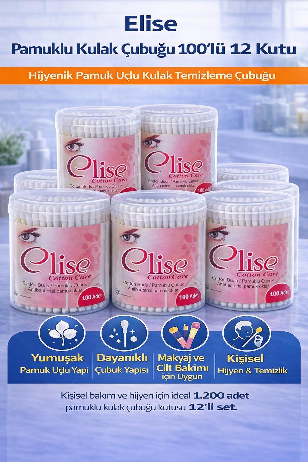 Elise Pamuklu Kulak Çubuğu 100'lü 12 Kutu set, günlük kişisel bakım ve hijyen ihtiyaçları için pratik ve ekonomik kullanım sunan pamuk uçlu kulak temizleme çubuklarından oluşur. Paket içerisinde her biri 100 adet pamuklu kulak çubuğu bulunan 12 kutu yer alır ve toplamda 1200 adet ürün içerir.