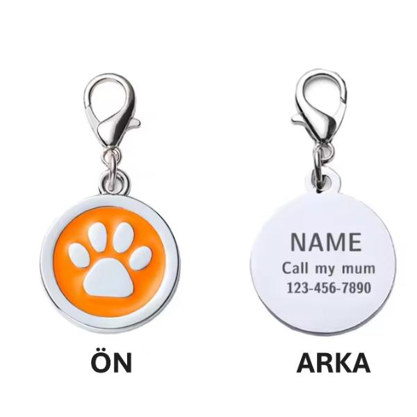 Evcil Hayvan Klipsli Tasma Künyesi, 2.5 cm boyutuyla hem hafif hem de dayanıklı bir yapıya sahiptir. Ön yüzünde sevimli patili tasarım bulunurken, arka yüzü tamamen boştur ve isteğinize göre isim, telefon numarası veya özel bir notla kolayca özelleştirilebilir. Klips mekanizması sayesinde tüm kedi ve köpek tasmalarına hızlıca takılabilir. Kaybolma riskine karşı güvenli bir çözüm sunar ve şık tasarımıyla evcil hayvanınızın tasmasına zarif bir dokunuş katar.