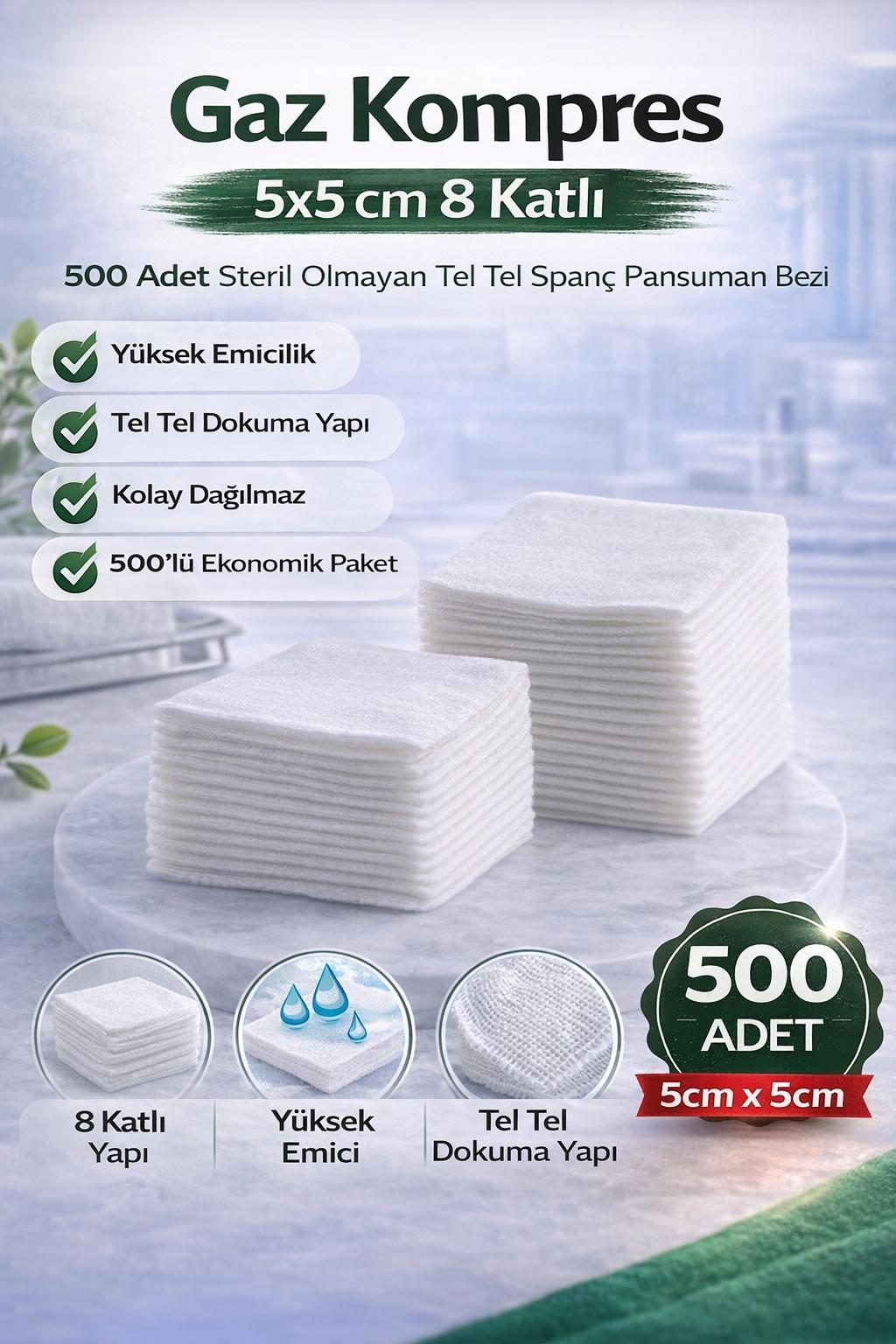 gaz kompres, tel tel spanç, 5x5 gazlı bez, 8 katlı gaz kompres, medikal spanç, pansuman bezi, steril olmayan gazlı bez, yara temizleme bezi, pamuk gaz kompres, hastane spanç, 500 adet gaz kompres, medikal pansuman pedi