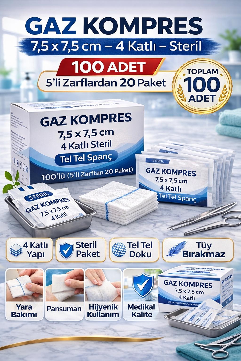 gaz kompres, tel tel spanç, steril gazlı bez, 7,5x7,5 kompres, 4 katlı gaz kompres, medikal spanç, pansuman bezi, steril pansuman pedi, yara temizleme gazlı bez, hastane spanç, 5’li steril spanç, 100 adet gaz kompres
