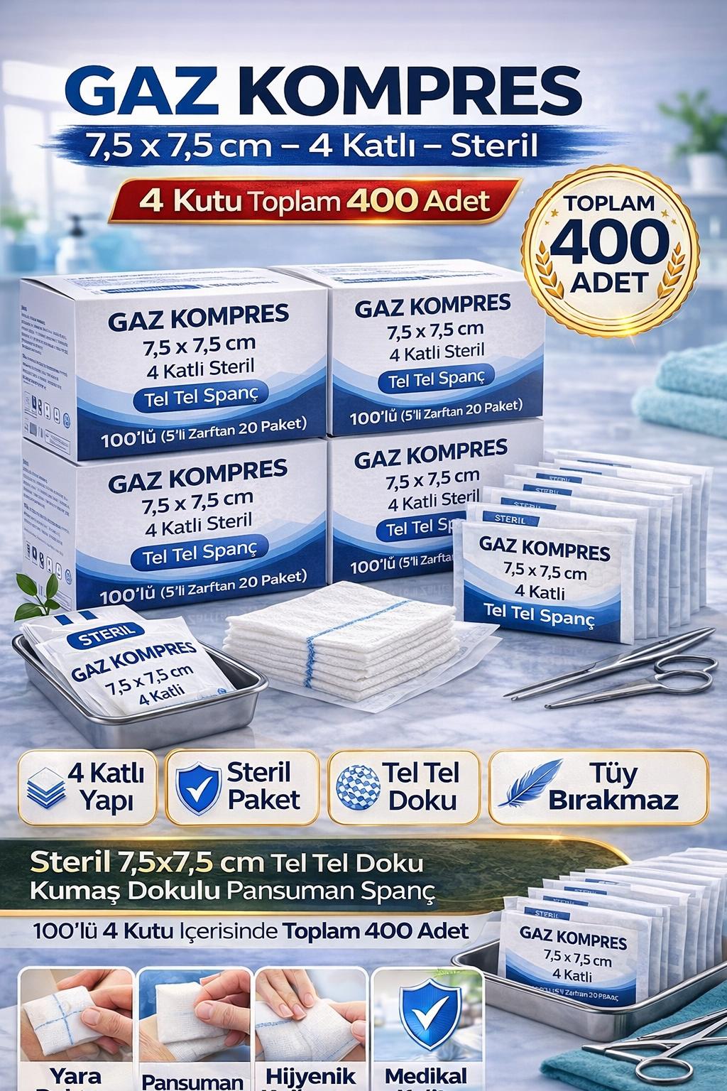 gaz kompres, tel tel spanç, steril gazlı bez, 7,5x7,5 kompres, 4 katlı gaz kompres, medikal spanç, pansuman bezi, steril pansuman pedi, yara temizleme gazlı bez, hastane spanç, 400 adet gaz kompres, 4 kutu kompres