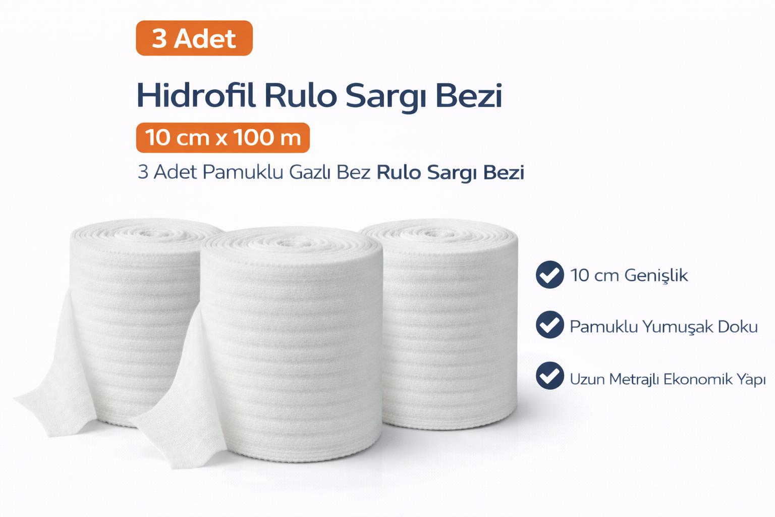 Hidrofil Rulo Sargı Bezi 10 cm x 100 m 3 Adet Pamuklu Gazlı Bez Rulo Sargı Bezi