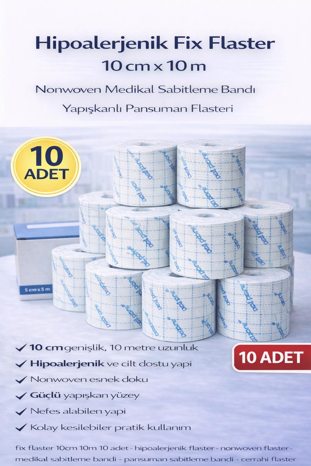 fix flaster 10cm 10m 10 adet, hipoalerjenik flaster, nonwoven flaster, medikal sabitleme bandı, pansuman sabitleme bandı, cerrahi flaster, geniş flaster, tıbbi flaster, fix bant, hastane flasteri