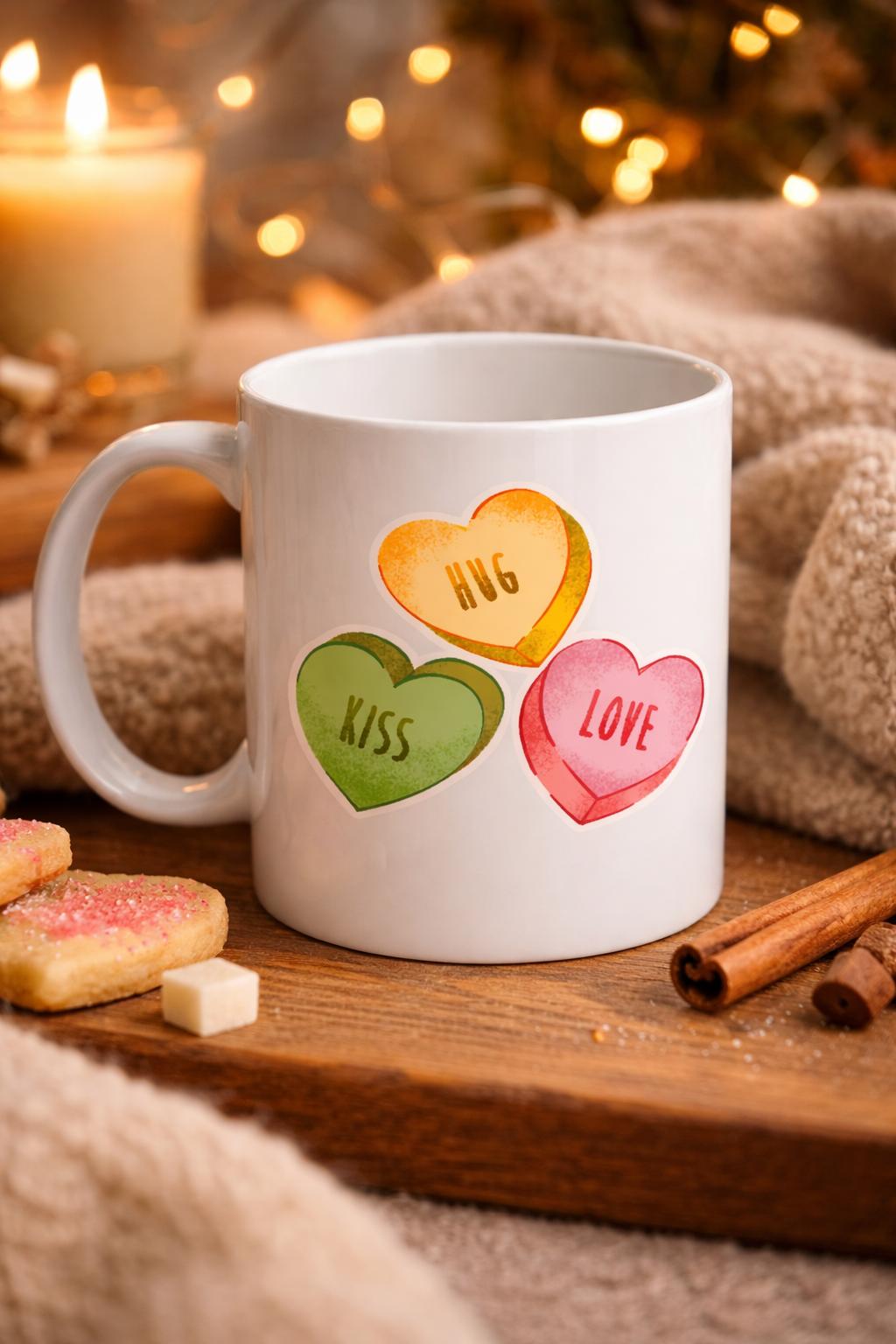 Hug, Kiss ve Love yazılı kalp figürleriyle süslenen Model 10 porselen kupa, pozitif enerjisiyle gününüze renk katar. Canlı renkleri ve tatlı tasarımı sayesinde hem kendiniz hem de sevdikleriniz için harika bir hediye seçeneğidir.