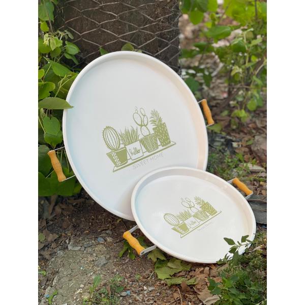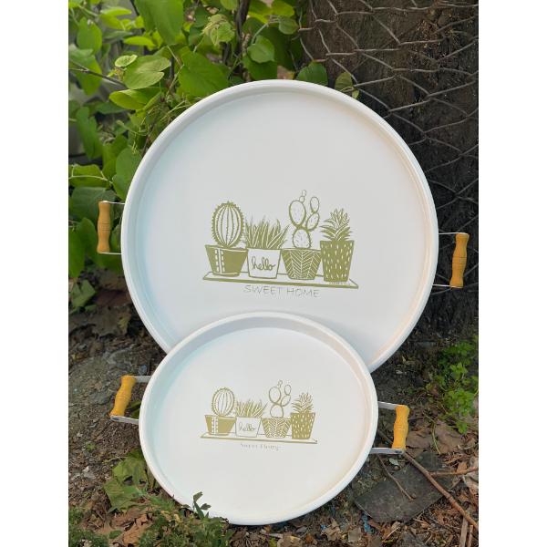 İKİLİ YUVARLAK SUNUM TEPSİSİ SETİÜrün ÖzellikleriBüyük boy tepsinin çapı 51 cm, küçük boy tepsinin çapı ise 37 cm'dir. Bu şık ikili tepsi seti, yuvarlak formu ve estetik tasarımıyla mükemmel bir sunum aracıdır. Ahşap tutma kulpları sayesinde rahatlıkla taşınabilir. Hem işlevsel hem de dekoratif olarak kullanılabilir. Evde misafir ağırlarken, kahve saati sunumları veya yemek servisleri için ideal bir seçenektir. Modern tarzı ve pratikliğiyle her evde yerini alacak.Paket İçeriği1 Adet İkili Yuvarlak Sunum Tepsisi Seti