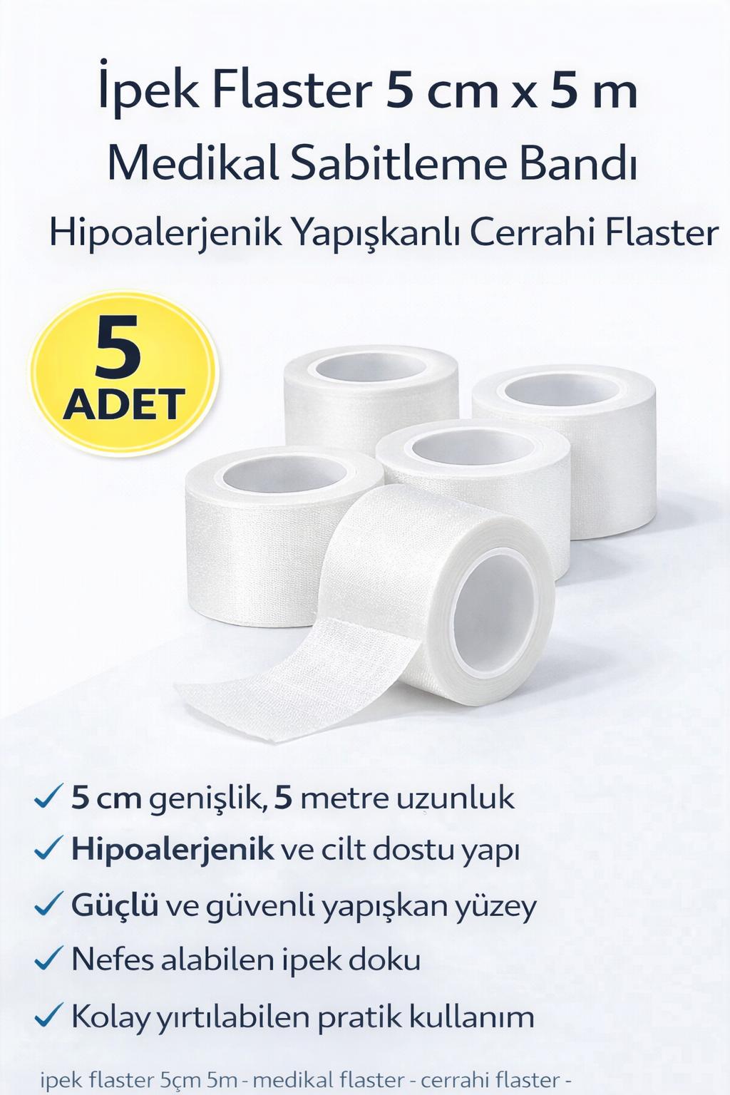 ipek flaster 5 adet, ipek flaster 5cm 5m, medikal flaster, cerrahi flaster, sabitleme bandı medikal, hipoalerjenik flaster, pansuman bandı, tıbbi flaster, ipek flaster bant, hastane flasteri