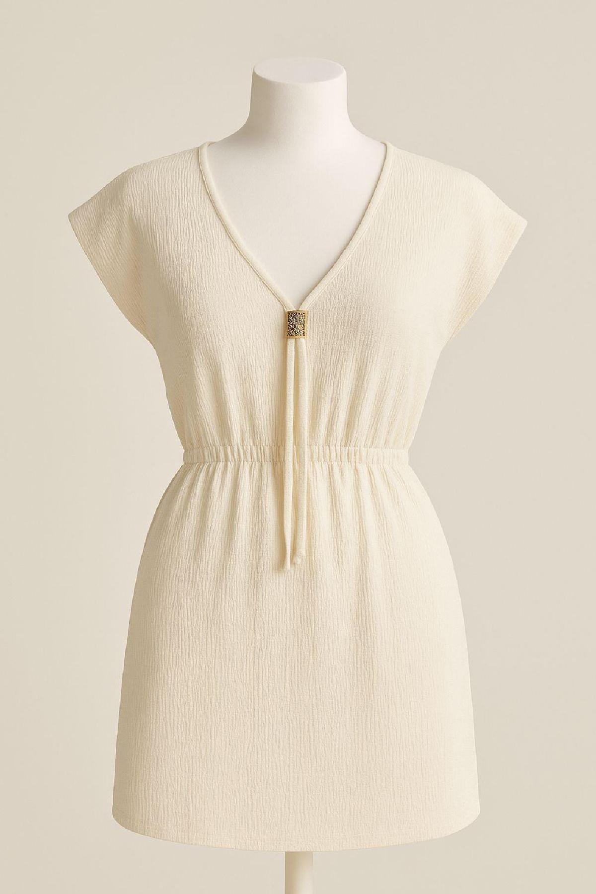 Plaj modasına şıklık katmak isteyen kadınların tercih edebileceği bu beyaz mini elbise, sade ama etkileyici tasarımıyla gardırobunuzun favorisi olmaya aday.