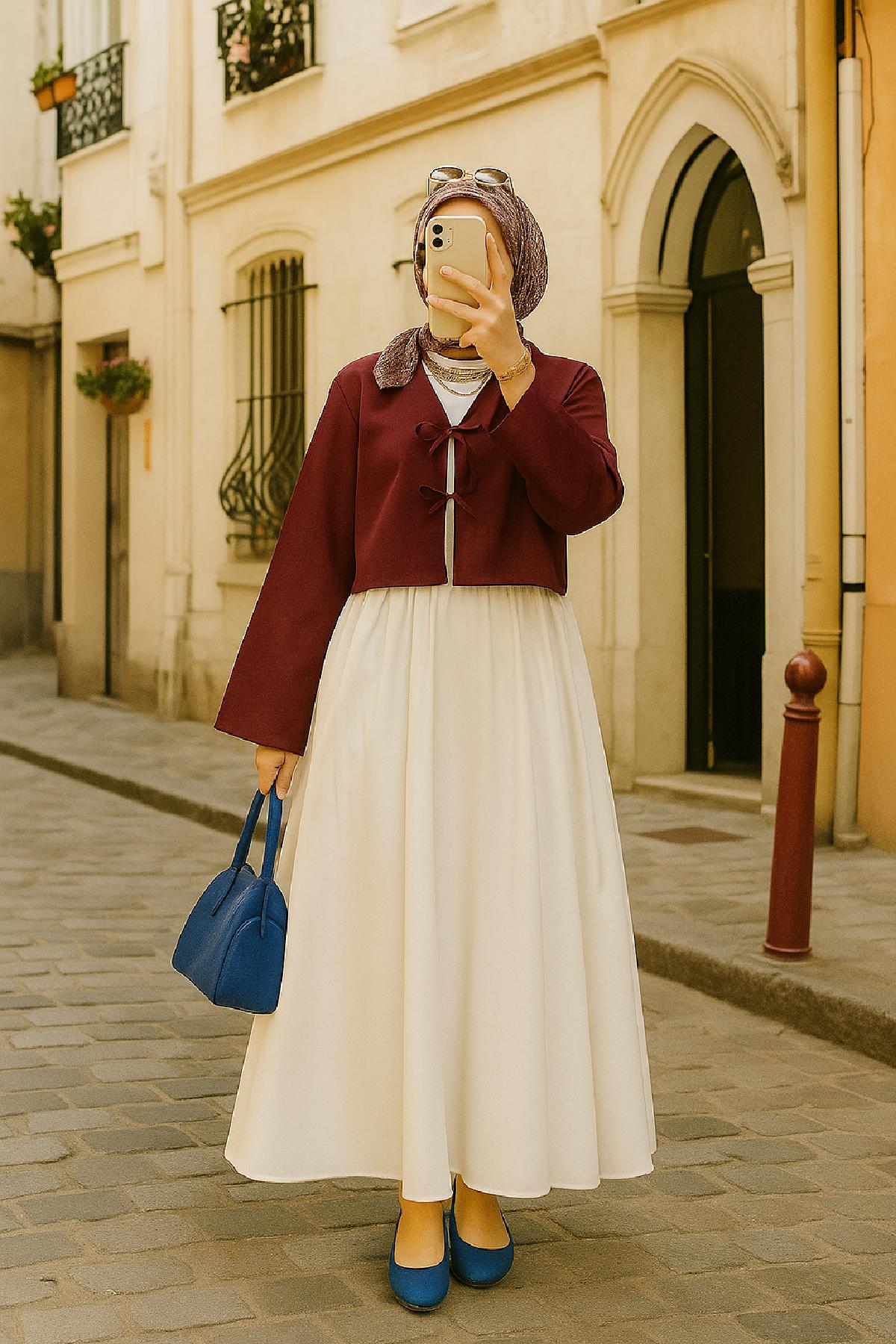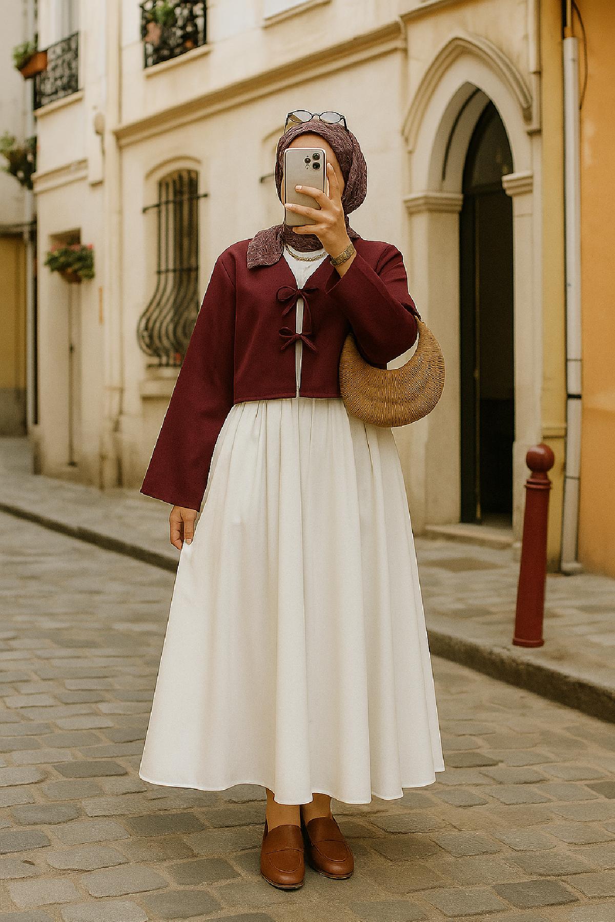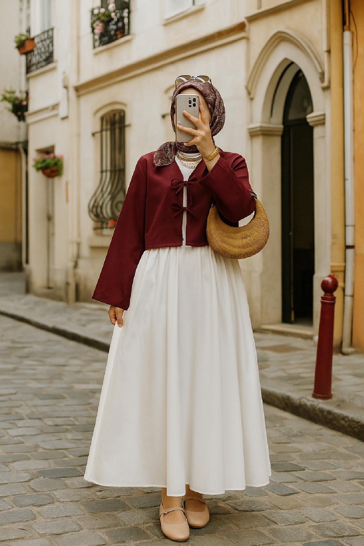 Her mevsime uyumlu yapısıyla öne çıkan bordo kısa kimono, özellikle ilkbahar ve sonbahar geçişlerinde hafif bir dış giyim olarak tercih edilebilir.