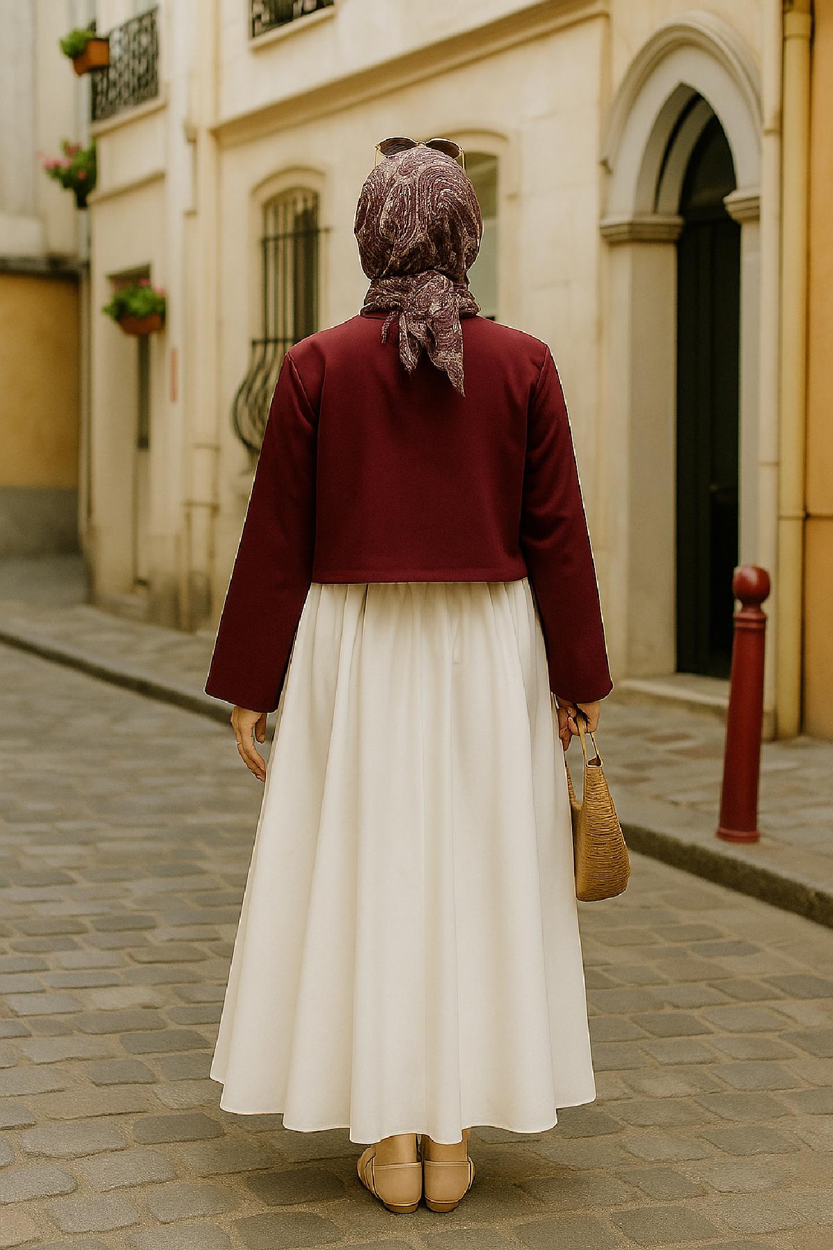 Kadın bordo kısa kimono ceket, zarif tasarımı ve modern çizgileriyle şıklığı günlük hayata taşıyor.