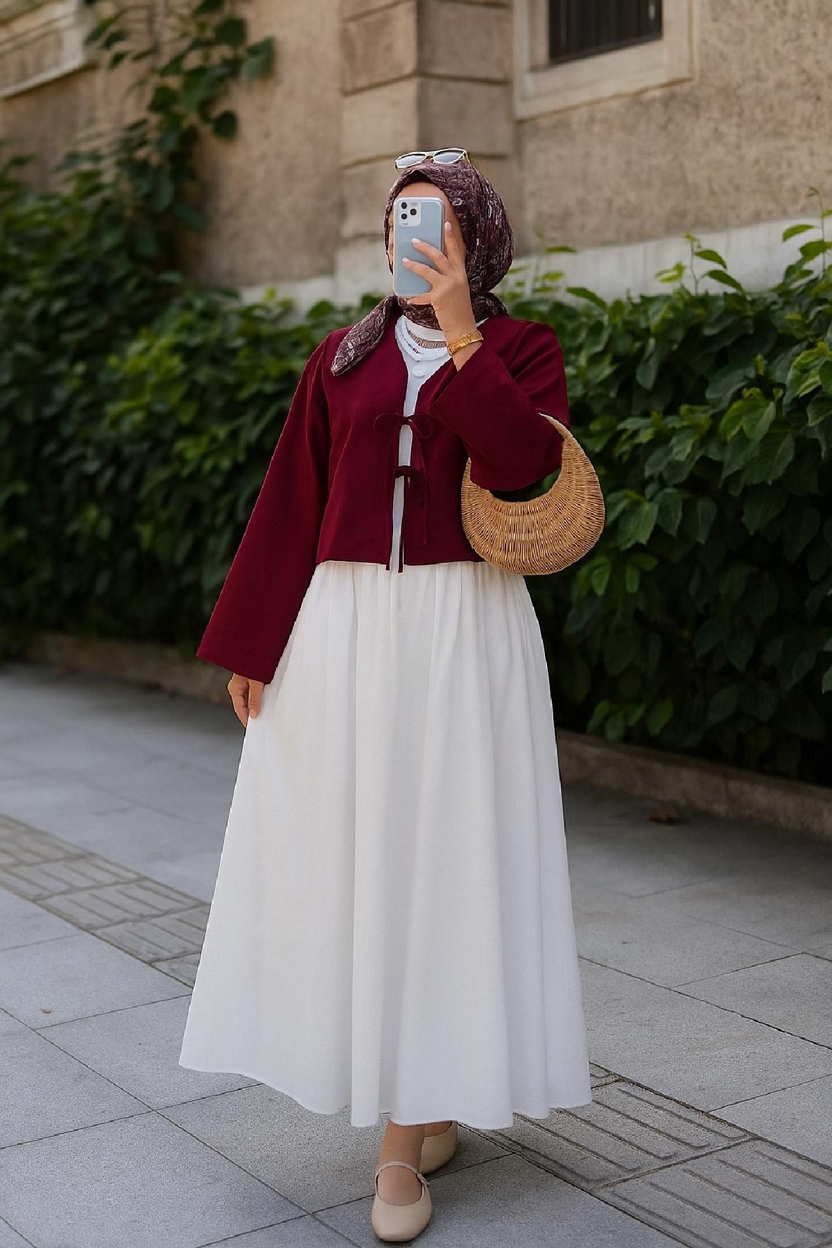 Kadın bordo kısa kimono ceket, modern tasarımı ve zarif detaylarıyla günlük kombinlerden özel davetlere kadar pek çok kullanım alanı sunar.