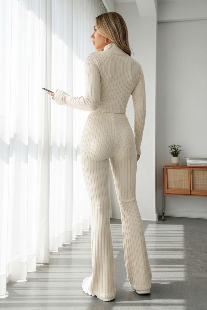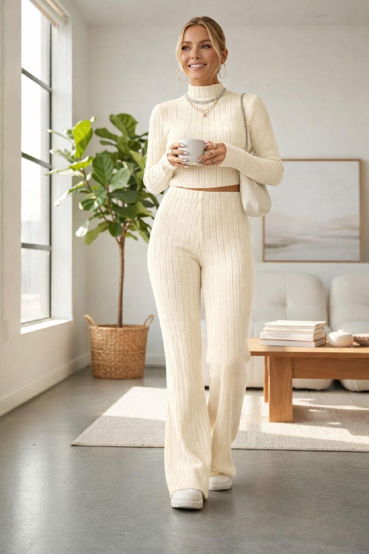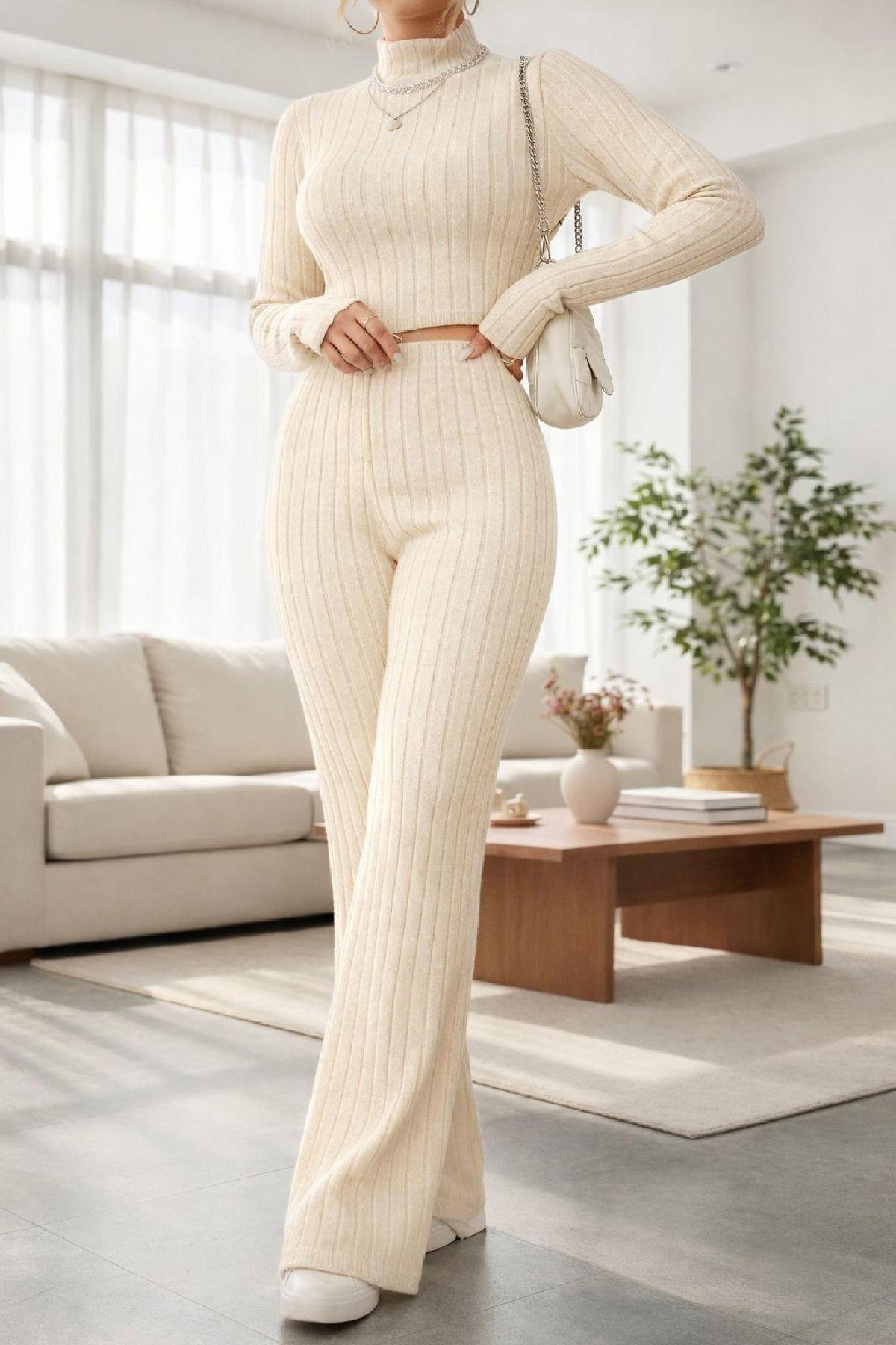 Şıklığı ve konforu bir arada sunan Kadın Ekru Çizgili Boğazlı Crop Top ve Yüksek Bel Eşofman Takımı, modern ve aktif yaşam tarzına uyum sağlayan tasarımıyla öne çıkar.