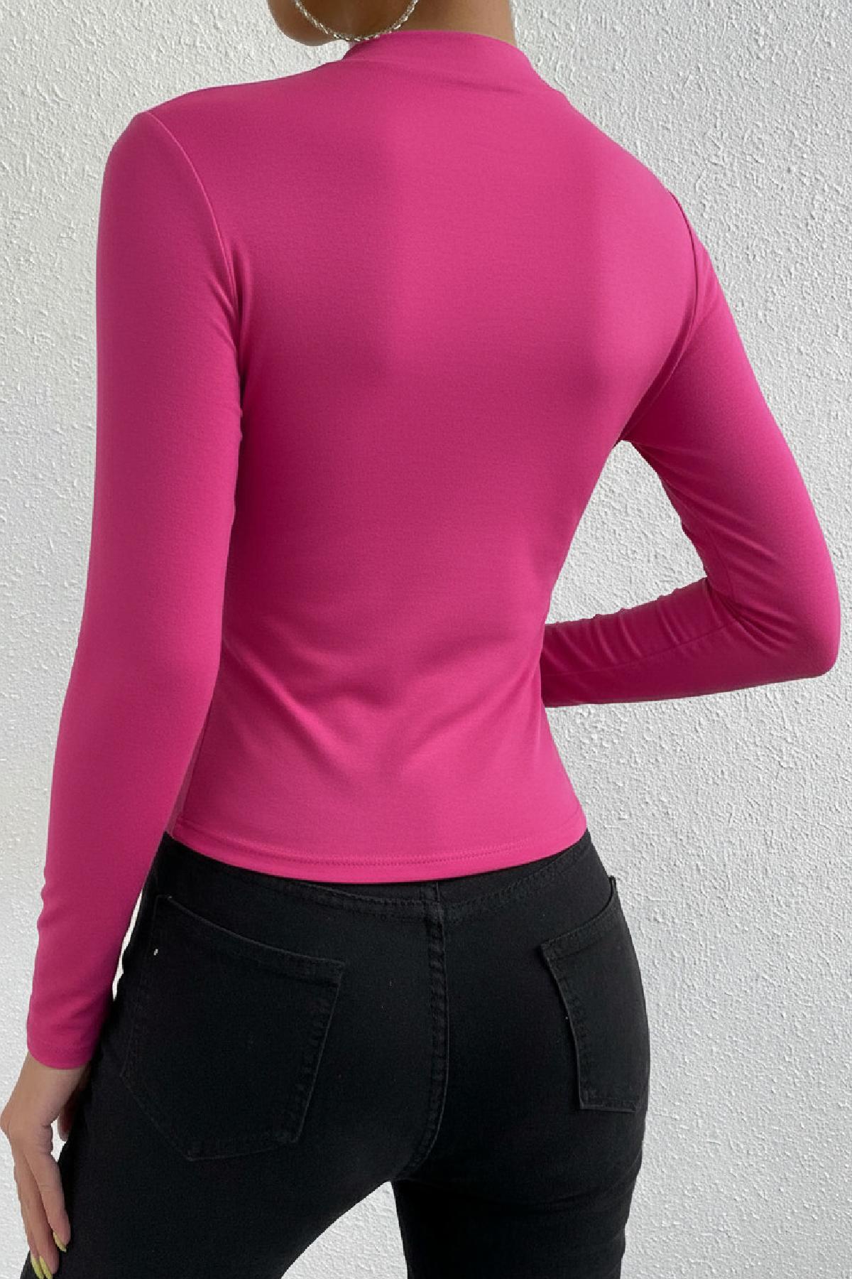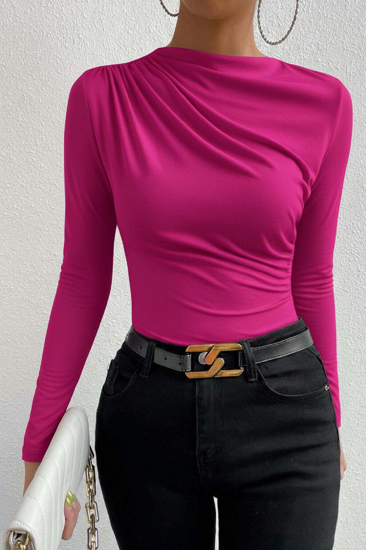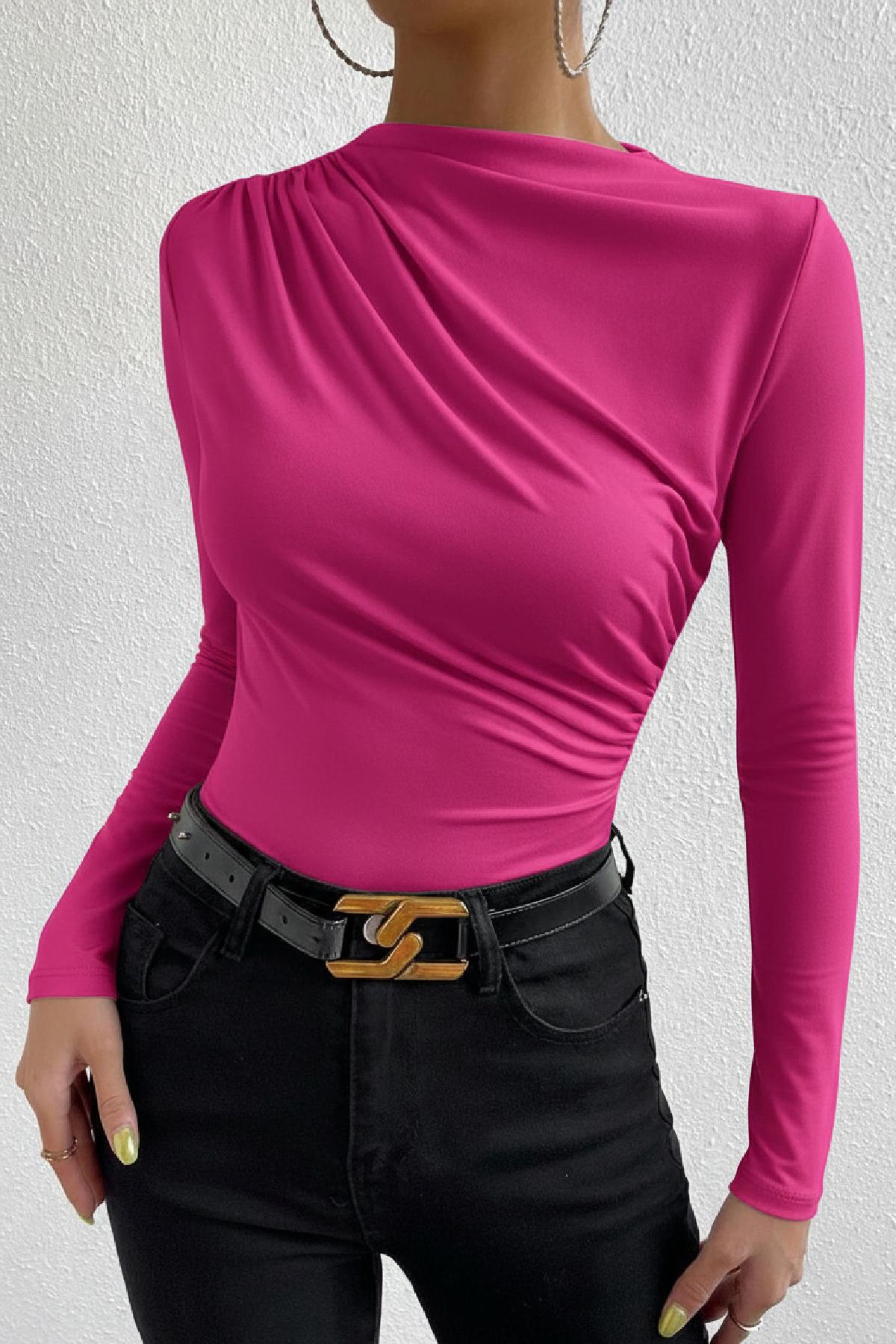 Kadın Fuşya Belden ve Boyundan Büzgü Detaylı Uzun Kollu Bluz, enerjik rengi ve zarif tasarımıyla gardırobunuzun öne çıkan parçalarından biri olacak.