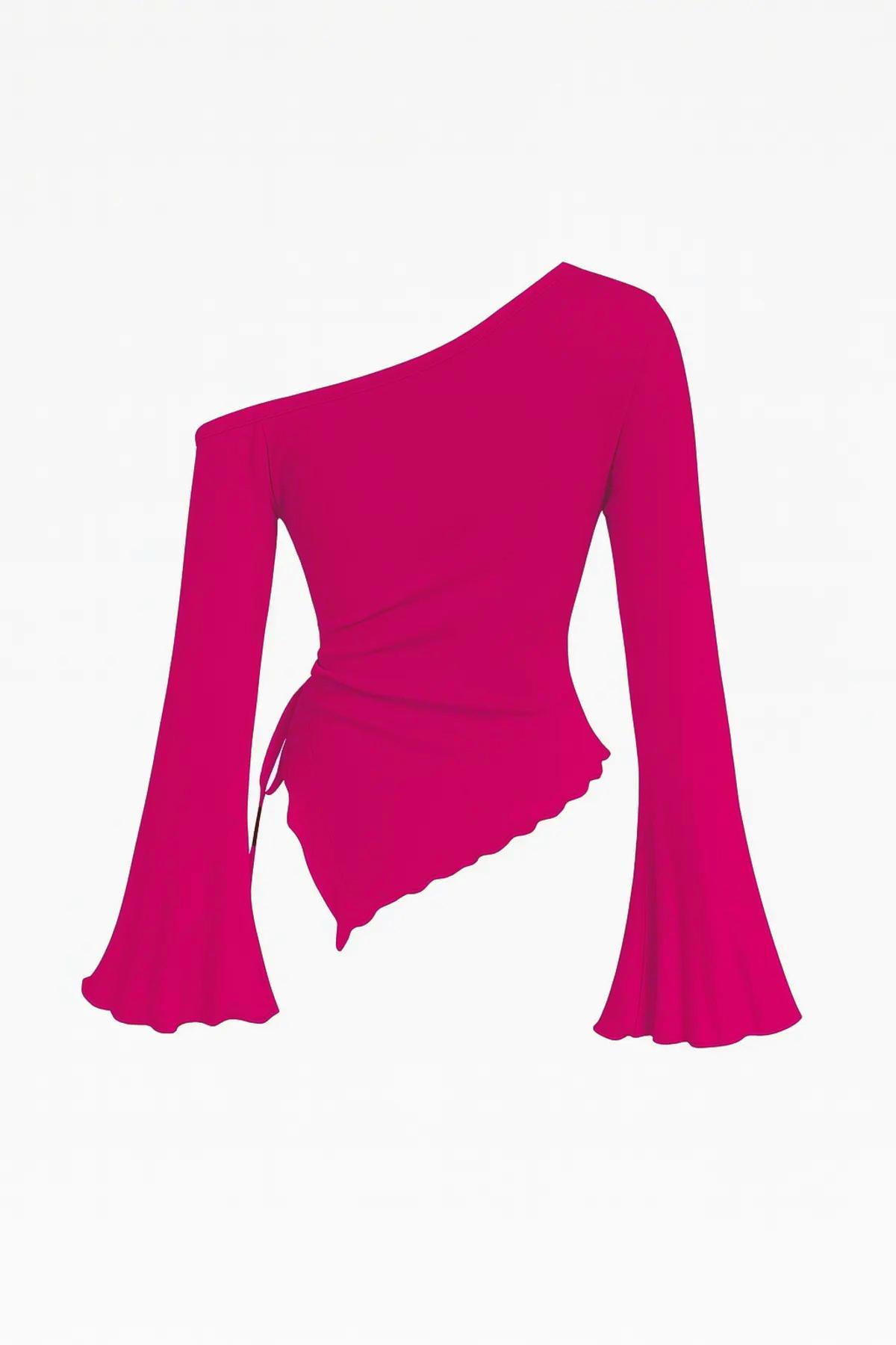 - İddialı ama zarif bir görünüm isteyenler için Kadın Fuşya Asimetrik Yaka Drapeli Yan Bağlamalı Bluz, gardırobun en enerjik parçalarından biri olacak.