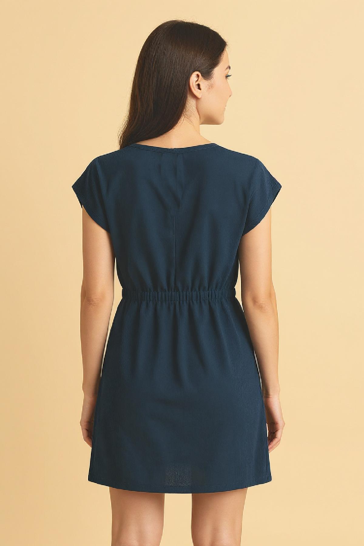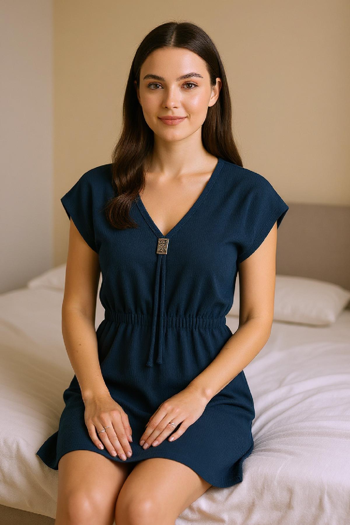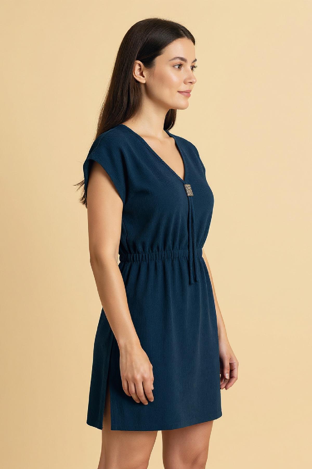 Kadın Lacivert Yanları Yırtmaçlı Tokalı V Yaka Mini Plaj Elbisesi, yazın zarifliğini ve konforunu bir arada sunuyor.