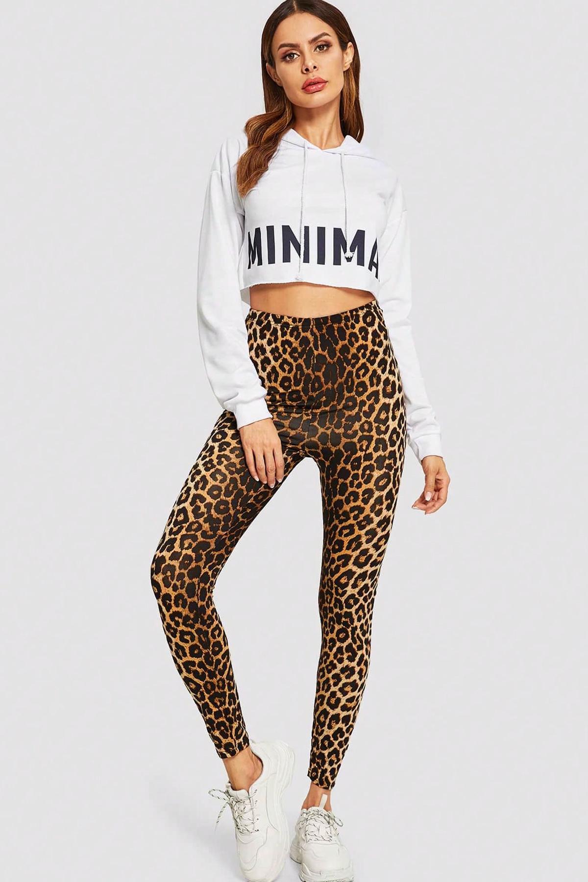 - Leopar deseniyle dikkat çeken yüksek bel dar tayt, spor şıklığınızı tamamlar.