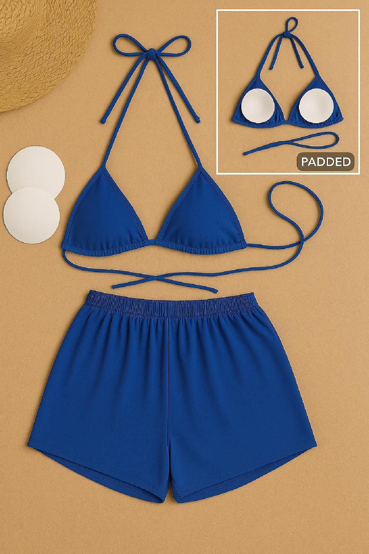 - Plaj şıklığınızı tamamlayacak, mavi renkli şortlu bikini takımı ile yaz günlerinin vazgeçilmezi olun.