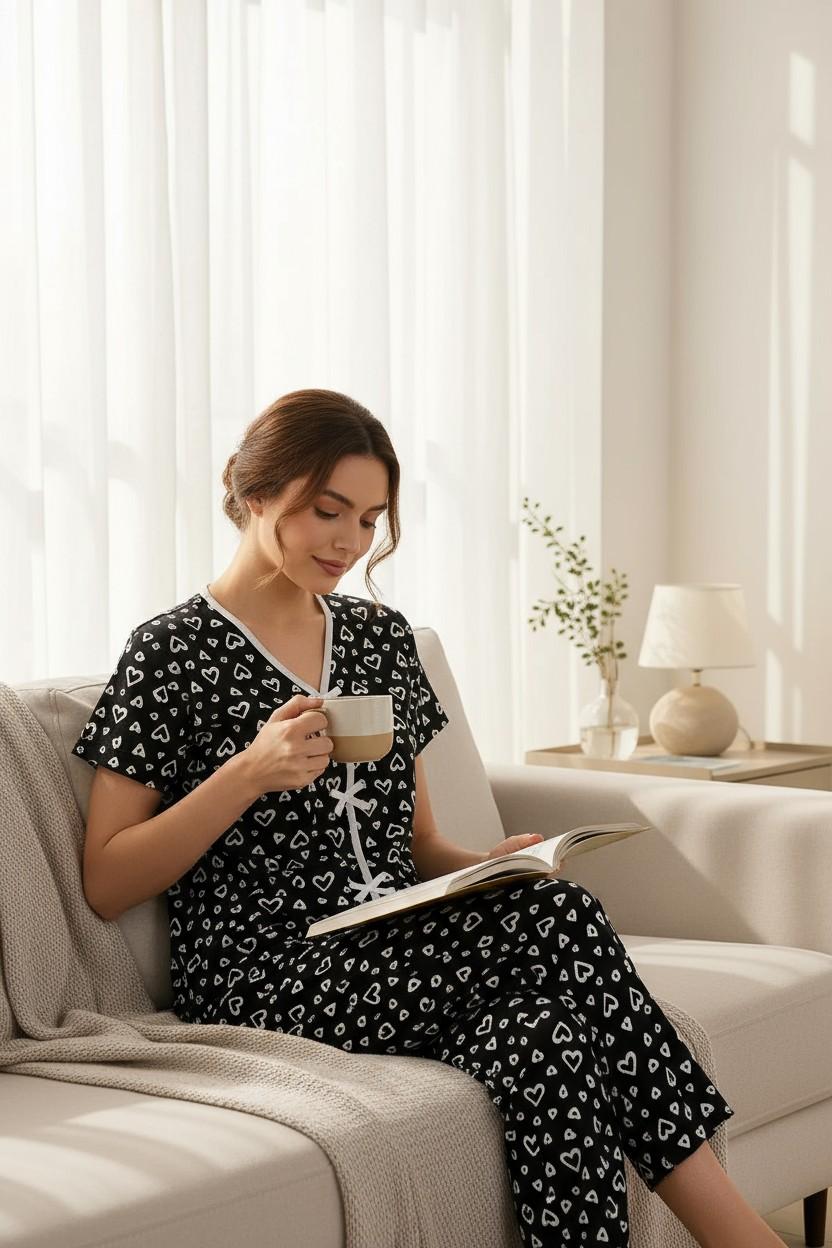 - Gecelerinizi konforlu, gündüzlerinizi şık hale getiren kadın siyah kalp desenli pijama takımı, rahatlığı ve modern tasarımı bir araya getiriyor.