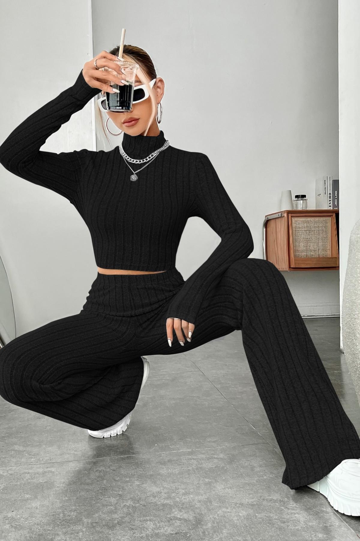 Crop formdaki uzun kollu üst, yüksek bel pantolon ile mükemmel bir uyum yakalayarak hem spor hem casual kombinlerde göz alıcı bir duruş sunar.