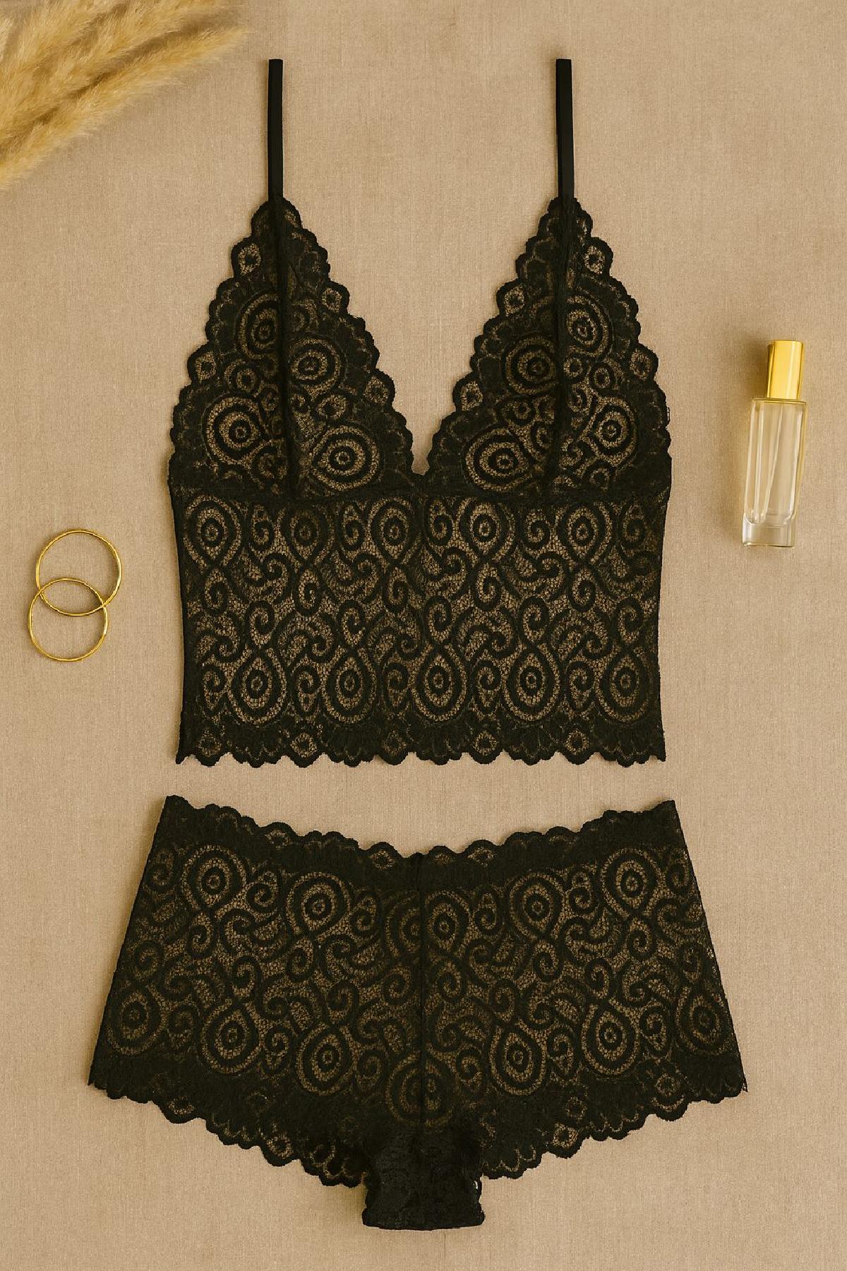 - Zarafetin ve cazibenin birleştiği siyah dantel bralet şort takımı, şıklığıyla göz kamaştırırken rahatlığıyla gün boyu konfor sağlar.