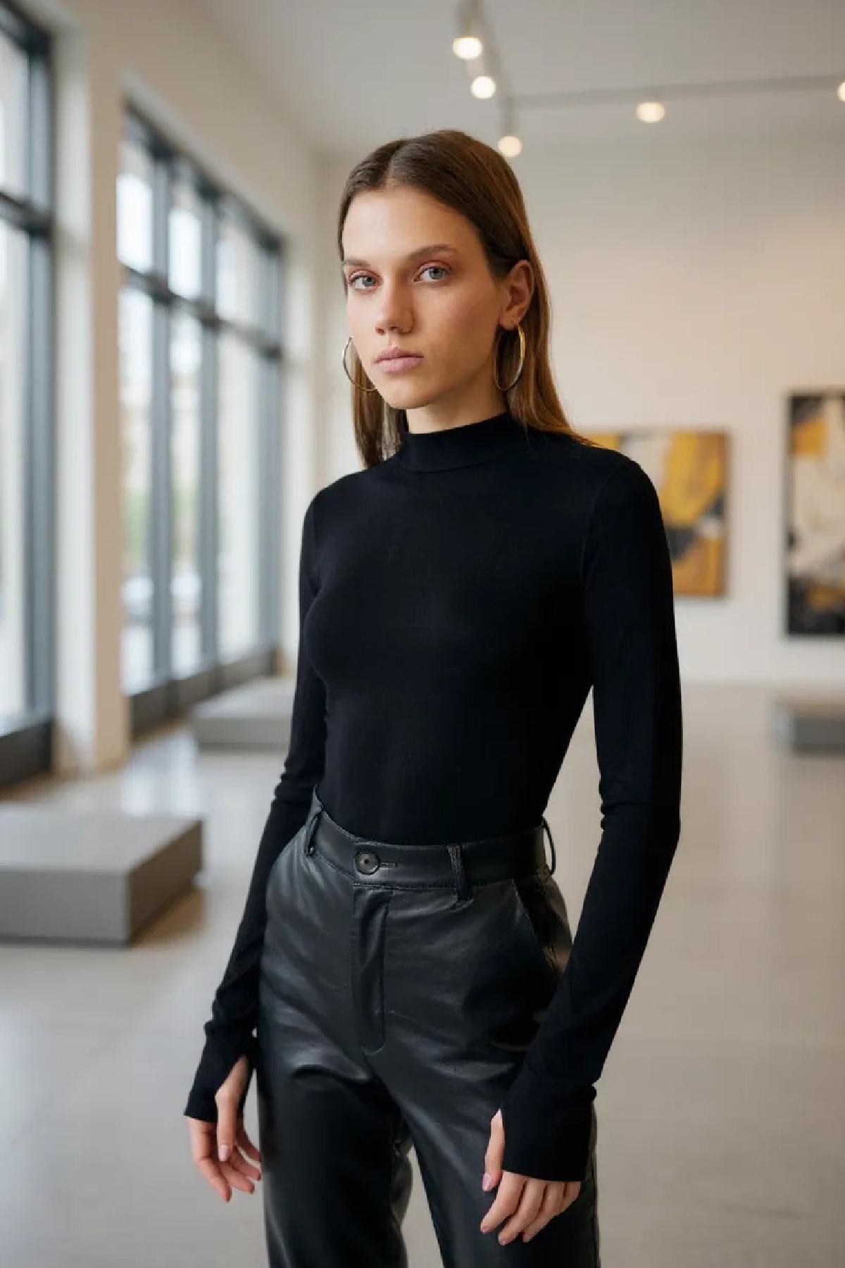Şıklık ve zarafeti bir arada sunan Kadın Siyah Parmak Detaylı Esnek Uzun Kollu Body, gardırobunuzun en kurtarıcı parçalarından biri olacak.